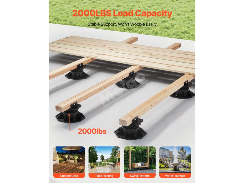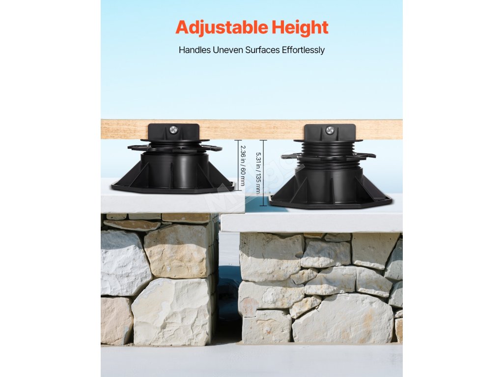 Náš nastaviteľný podstavec na podopretie paluby udržiava ideálnu vzdialenosť od zeme, čím izoluje vlhkosť a vytvára účinný drenážny systém. Zabraňuje poškodeniu dreva vlhkosťou a korózii a zároveň ukrýva káble alebo potrubia pre väčšiu bezpečnosť a odolnosť.