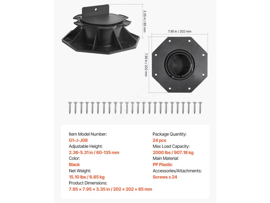 Trvanlivé a odolné voči vlhkosti a korózii sú naše podstavce na podopretie paluby vyrobené z vysokopevnostného PP materiálu. Dajú sa nastaviť v rozsahu od 2,36 do 5,31 palca, ľahšie sa inštalujú a premiestňujú ako tradičné drevené stĺpiky a sú ideálne na terasy, vonkajšie terasy, hojdacie plošiny, fontány a iné.