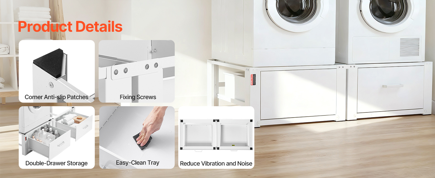 Tento podstavec pod práčku a sušičku je vyrobený z vysoko kvalitnej ocele a je vhodný na domáce použitie. Zosilnený rám unesie ťažké zaťaženie bez ohýbania, čím pomáha udržiavať dlhodobú stabilitu a spoľahlivý výkon.