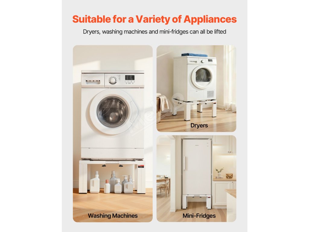 Tento univerzálny podstavec na práčku je starostlivo navrhnutý tak, aby pasoval takmer na všetky práčky a sušičky. Nech už používate Samsung, LG, Whirlpool, GE, Miele, Electrolux alebo Bosch, podstavec sa hladko prispôsobí a zaručuje bezpečnú a spoľahlivú inštaláciu.