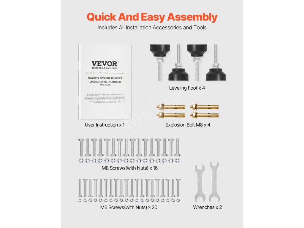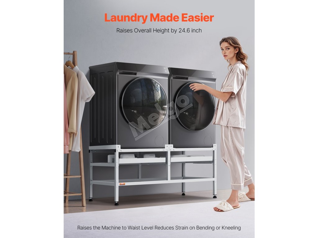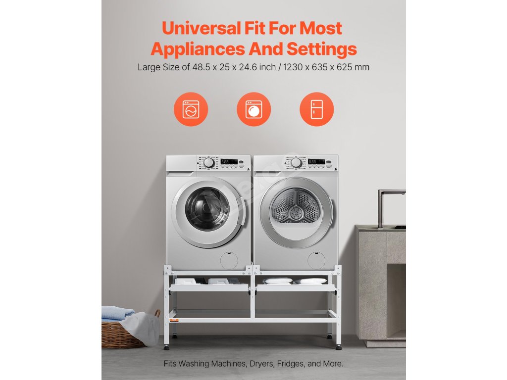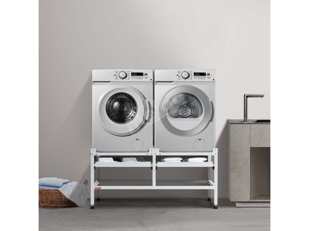 Multifunkčný stojan na práčky a sušičky je vysoko výkonné zariadenie. Na tento podstavec môžete jednoducho a bezpečne umiestniť sušičku a práčku. Je vyrobený z odolnej uhlíkovej ocele, ktorá poskytuje spoľahlivú nosnosť.