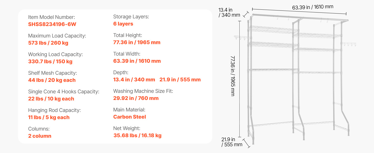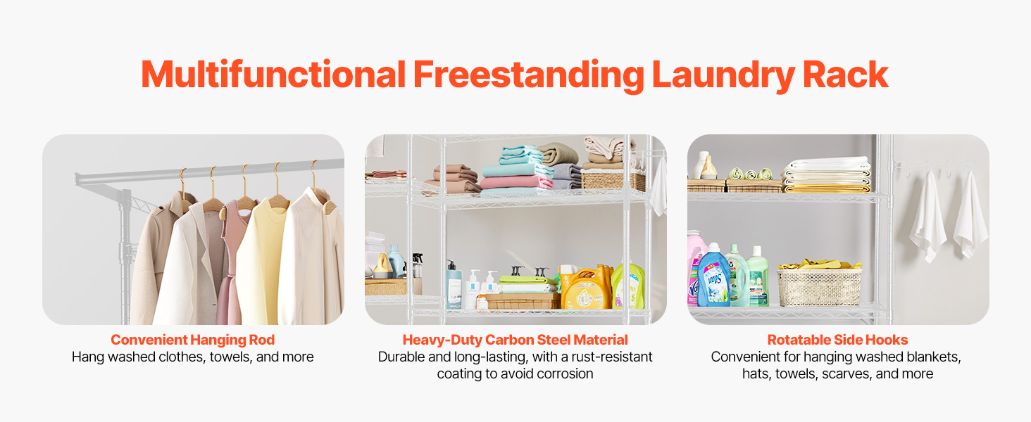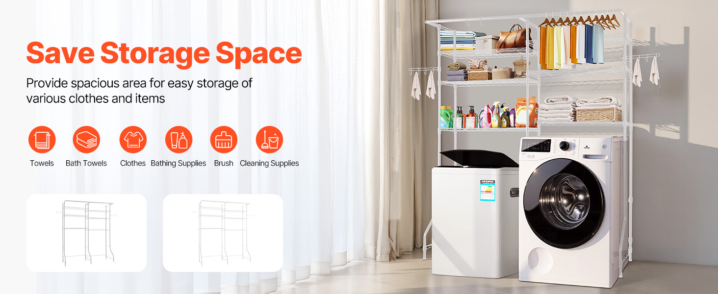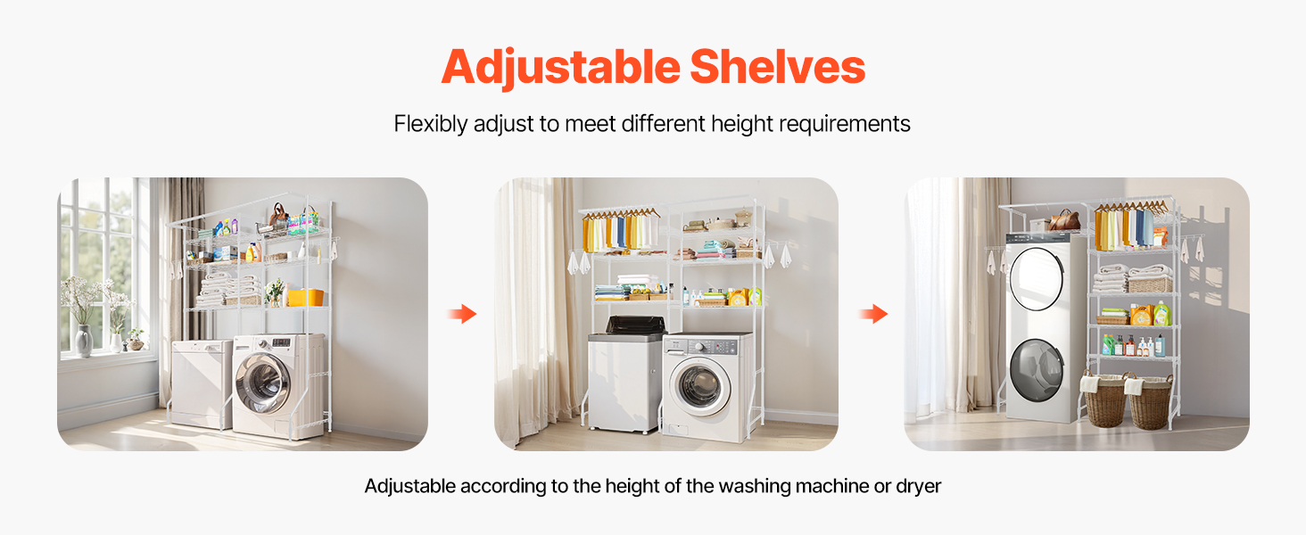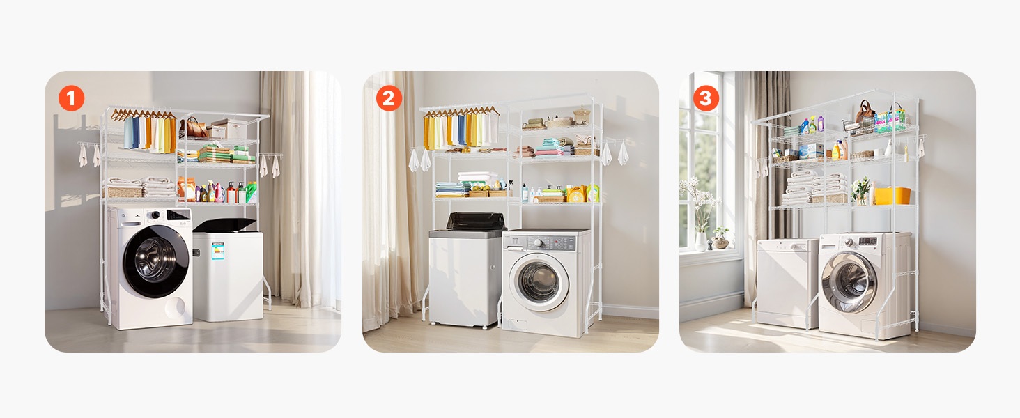 Kompaktný a odolný regál na práčku a sušičku Tento regál nad práčku a sušičku s nastaviteľnými policami, tyčami a háčikmi je vhodný pre väčšinu práčok. Je vyrobená z odolnej uhlíkovej ocele odolnej voči korózii, unesie až 330,7 libier / 150 kg a je vybavená zariadením proti prevráteniu a jednoduchou inštaláciou.