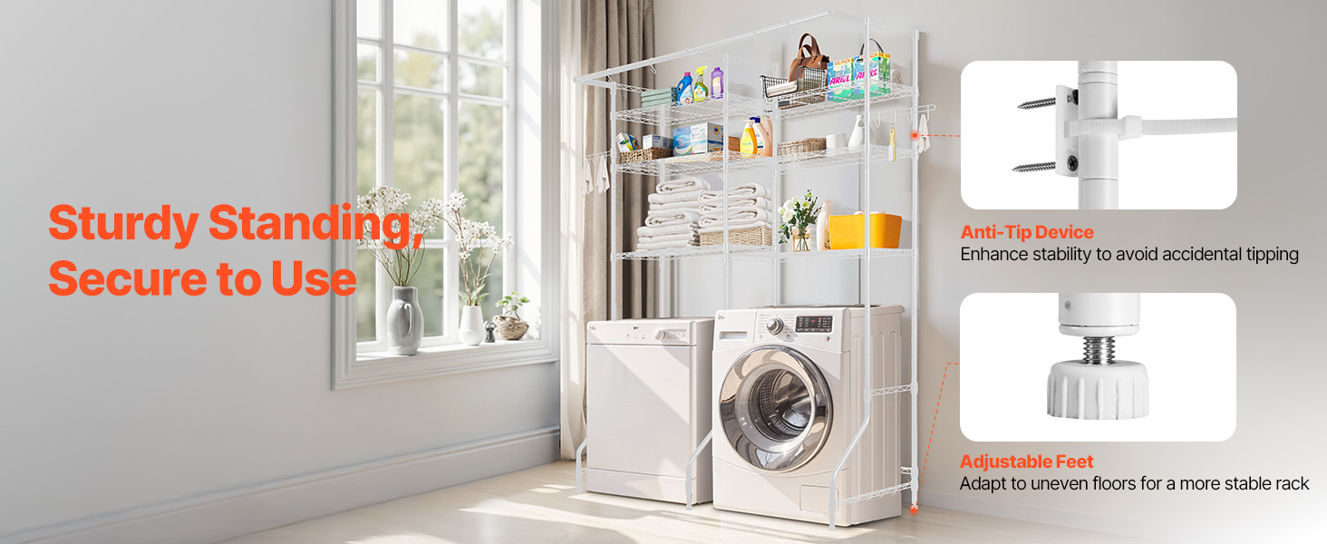Nastaviteľné nožičky a zariadenie proti prevráteniu zaisťujú, že tento regál na práčku zostane stabilný a poskytne spoľahlivú oporu pri rôznych nastaveniach.