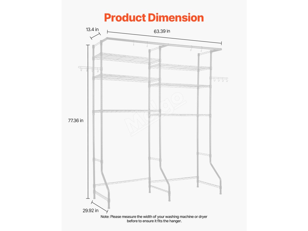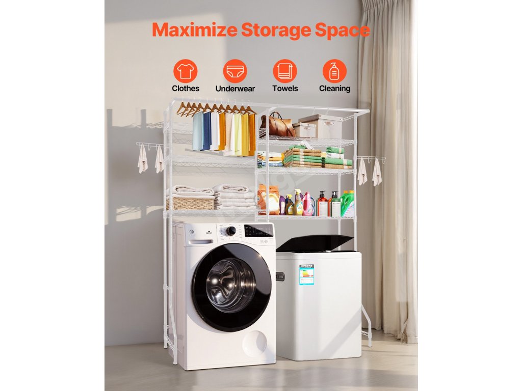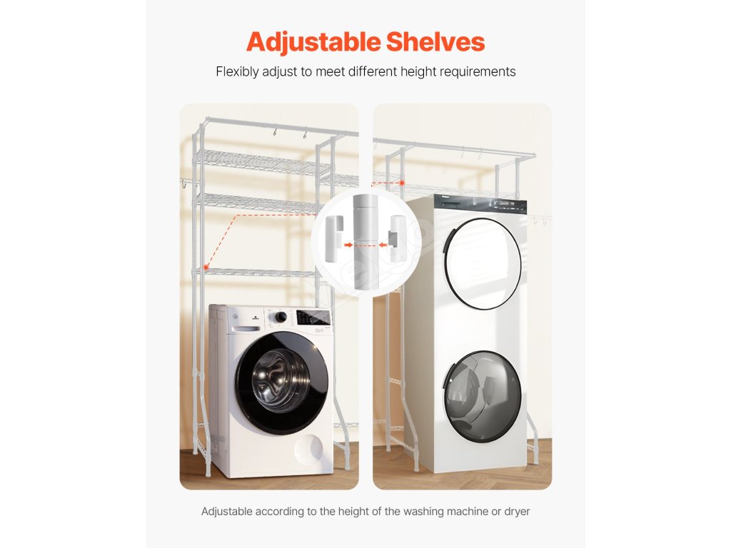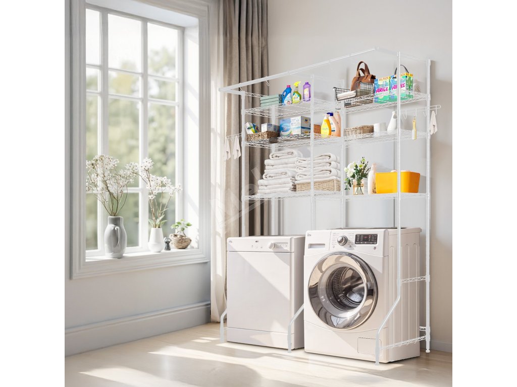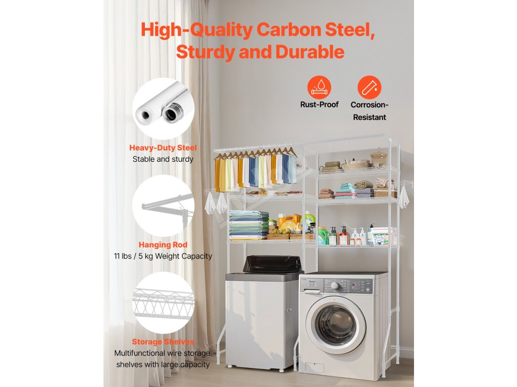 Kompaktný a odolný regál na práčku a sušičku Tento regál nad práčku a sušičku s nastaviteľnými policami, tyčami a háčikmi je vhodný pre väčšinu práčok. Je vyrobená z odolnej uhlíkovej ocele odolnej voči korózii, unesie až 330,7 libier / 150 kg a je vybavená zariadením proti prevráteniu a jednoduchou inštaláciou.