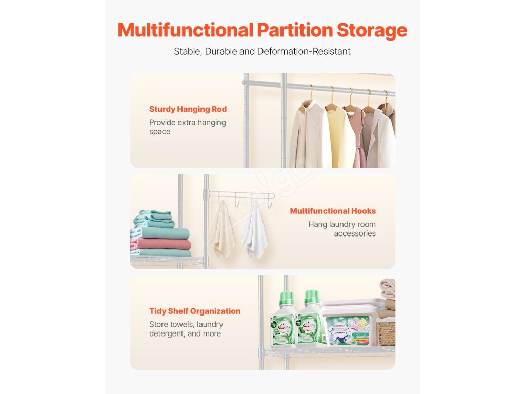 Táto úložná polica na práčku a sušičku kombinuje závesnú tyč, nastaviteľné police a otočné háčiky, ktoré spĺňajú rôznorodé potreby na uskladnenie.