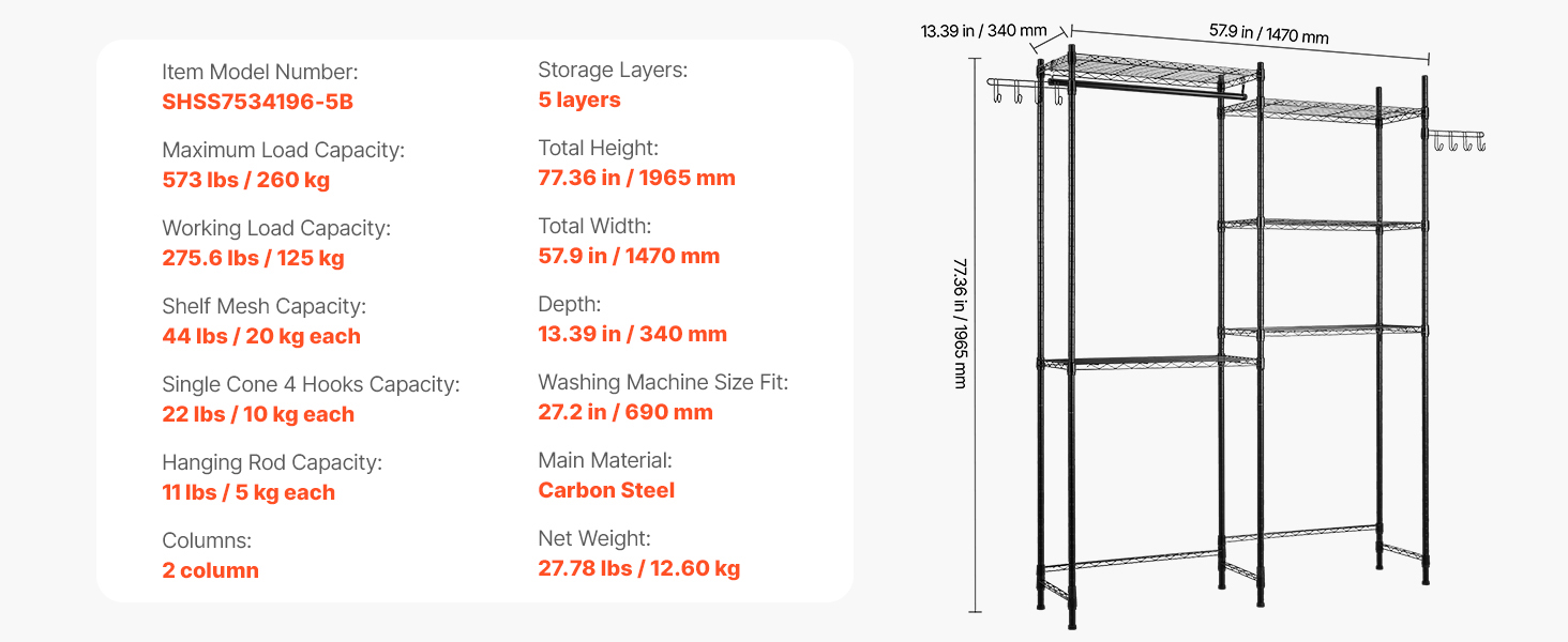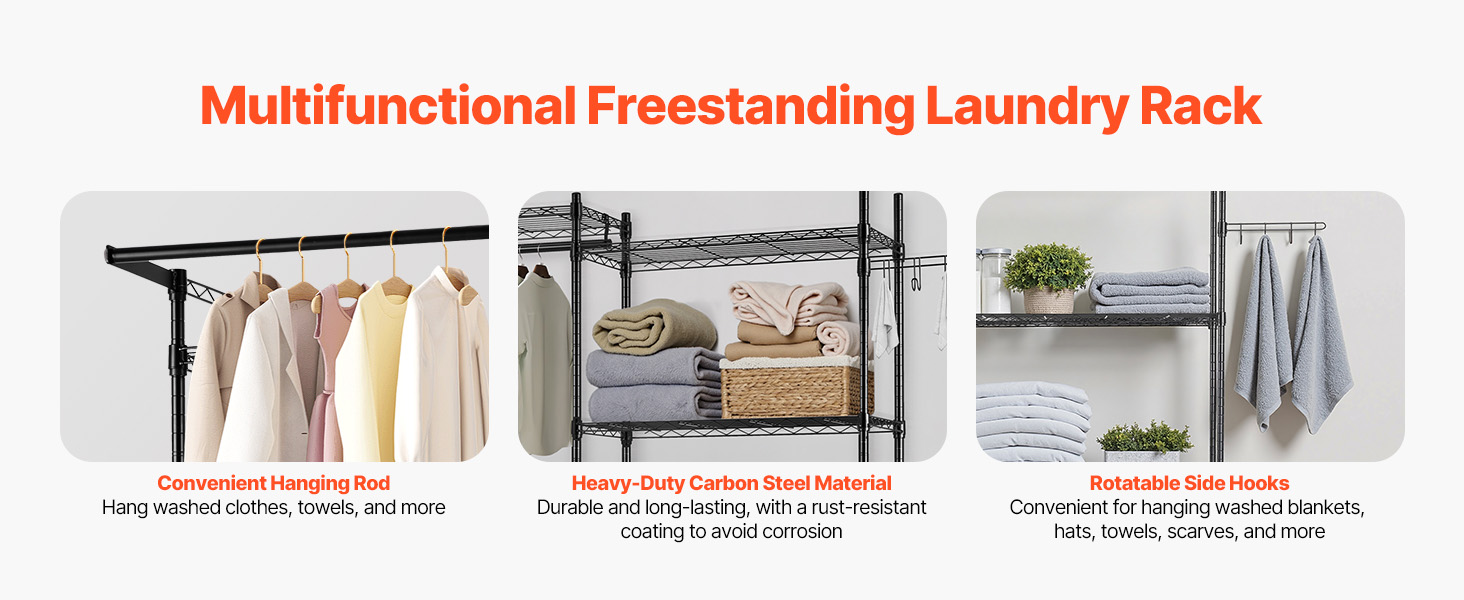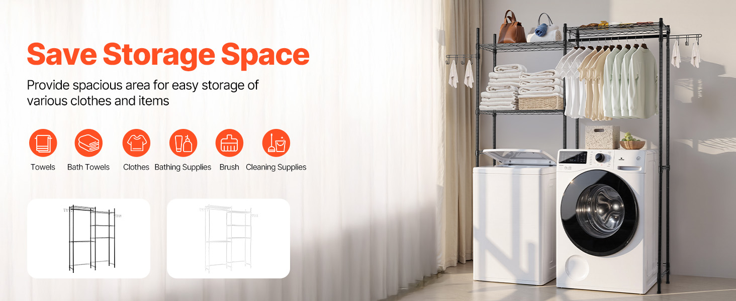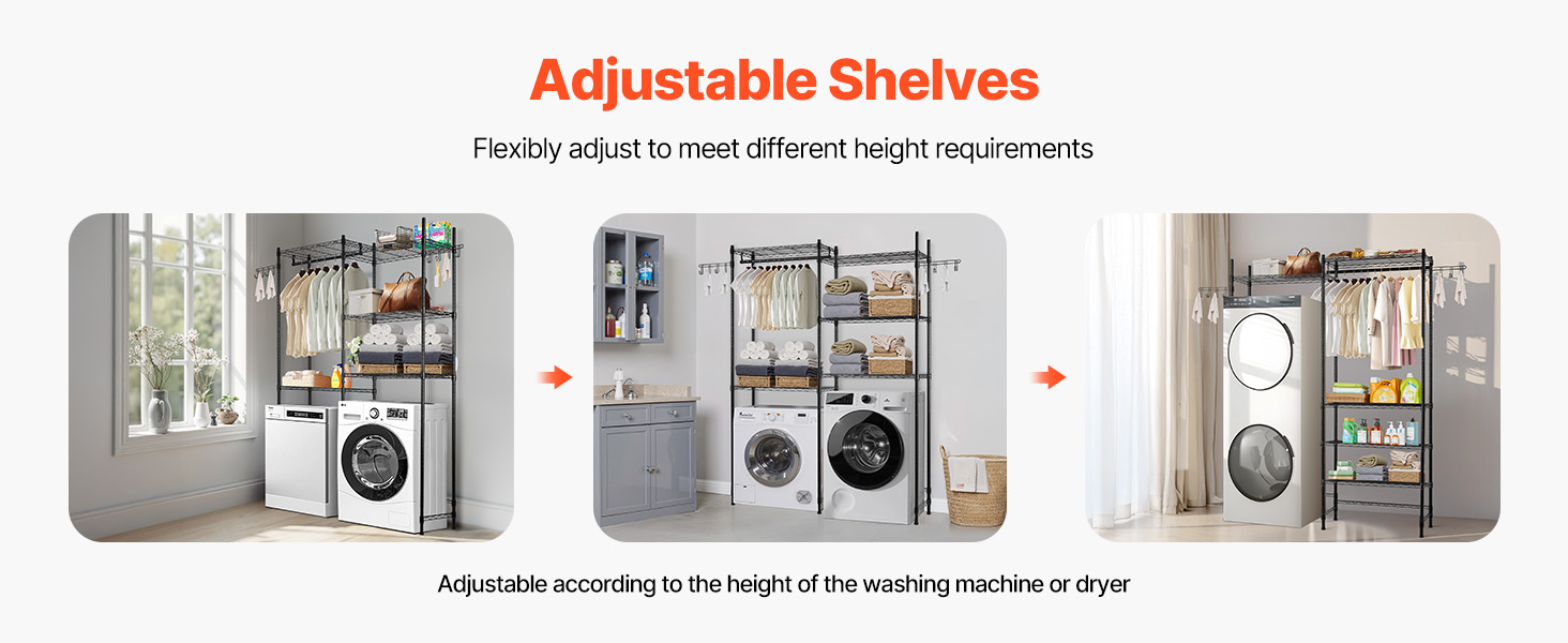 Kompaktný a odolný regál na práčku a sušičku Tento regál nad práčku a sušičku s nastaviteľnými policami, tyčami a háčikmi je vhodný pre väčšinu práčok. Je vyrobená z odolnej uhlíkovej ocele odolnej voči korózii, unesie až 275,6 libier / 125 kg a je vybavená zariadením proti prevráteniu a jednoduchou inštaláciou.