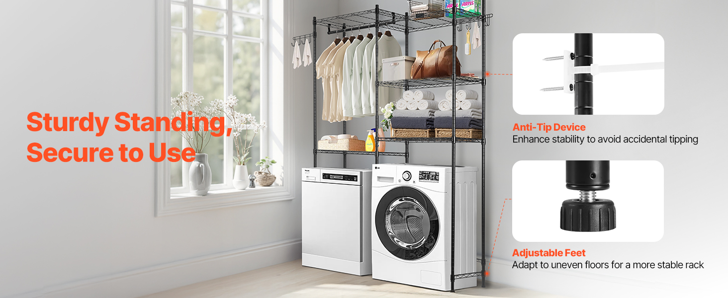 Nastaviteľné nožičky a zariadenie proti prevráteniu zaisťujú, že tento regál na práčku zostane stabilný a poskytne spoľahlivú oporu pri rôznych nastaveniach.
