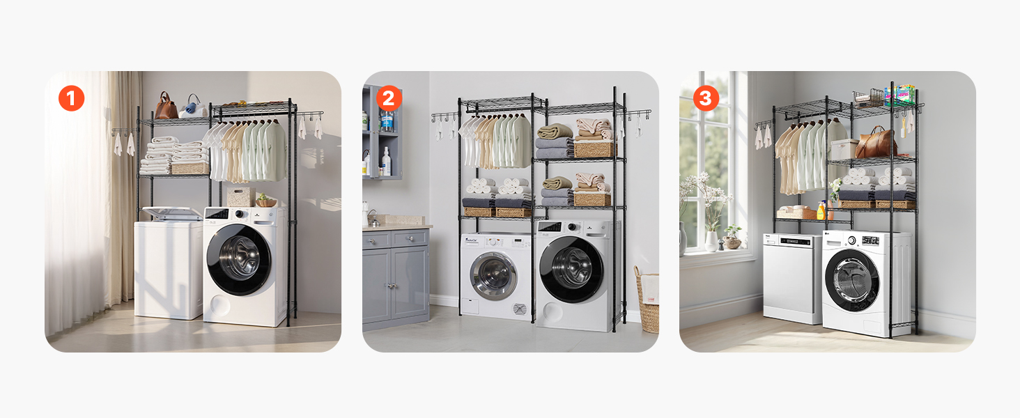Táto úložná polica na práčku a sušičku kombinuje závesnú tyč, nastaviteľné police a otočné háčiky, ktoré spĺňajú rôznorodé potreby na uskladnenie.
