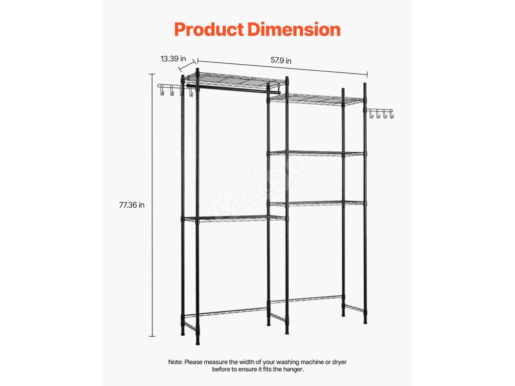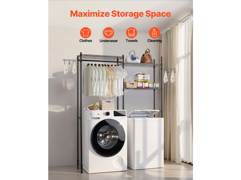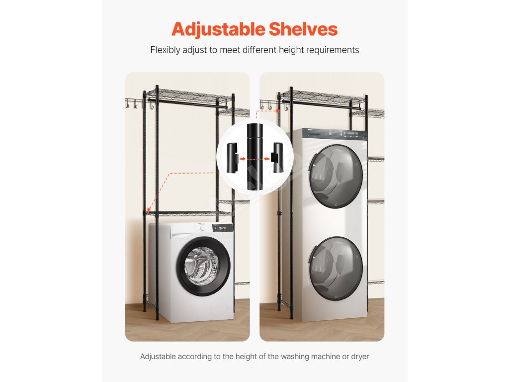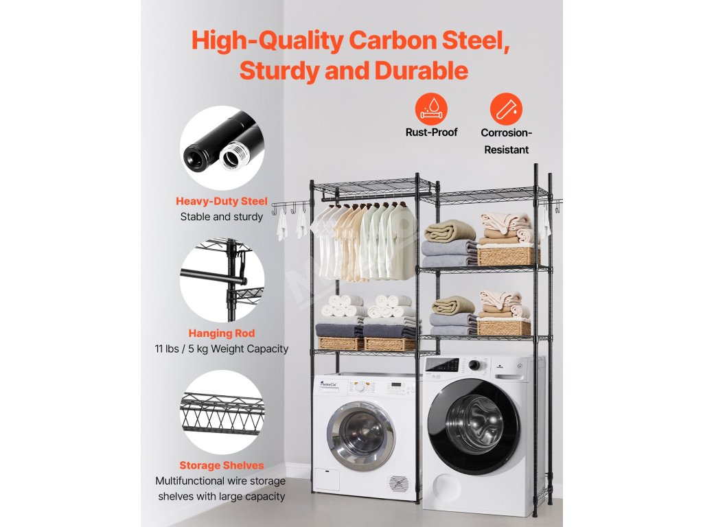 Kompaktný a odolný regál na práčku a sušičku Tento regál nad práčku a sušičku s nastaviteľnými policami, tyčami a háčikmi je vhodný pre väčšinu práčok. Je vyrobená z odolnej uhlíkovej ocele odolnej voči korózii, unesie až 275,6 libier / 125 kg a je vybavená zariadením proti prevráteniu a jednoduchou inštaláciou.