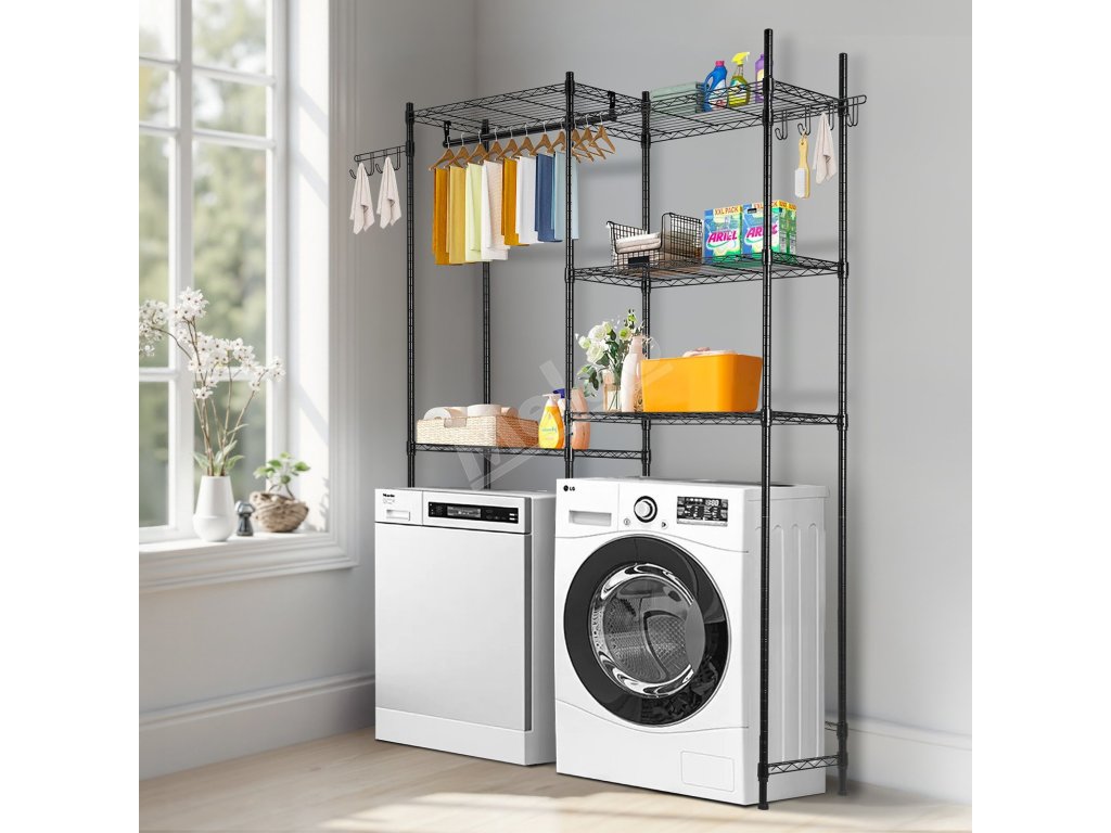 Táto úložná polica na práčku a sušičku kombinuje závesnú tyč, nastaviteľné police a otočné háčiky, ktoré spĺňajú rôznorodé potreby na uskladnenie.