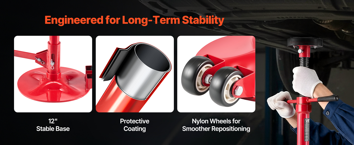 Tento podperný stojan pod zdvihák kombinuje širokú základňu, vystuženú konštrukciu a funkcie ľahkého umiestnenia, ktoré pomáhajú udržiavať stabilnú polohu počas servisných prác pod vozidlom. Poskytuje vyváženú a spoľahlivú oporu, na ktorú sa môžete spoľahnúť pri každodenných úlohách údržby vozidla.