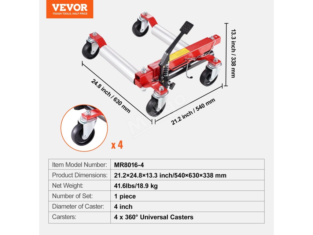 Naše zdviháky kolies pre automobily sú vybavené 4-palcovými univerzálnymi kolieskami na jednoduchý pohyb vozidla v akomkoľvek smere. Znížte prácnosť a zabráňte nechcenému pohybu. Zabezpečte požadovanú polohu jednoduchým stlačením nožnej brzdy.