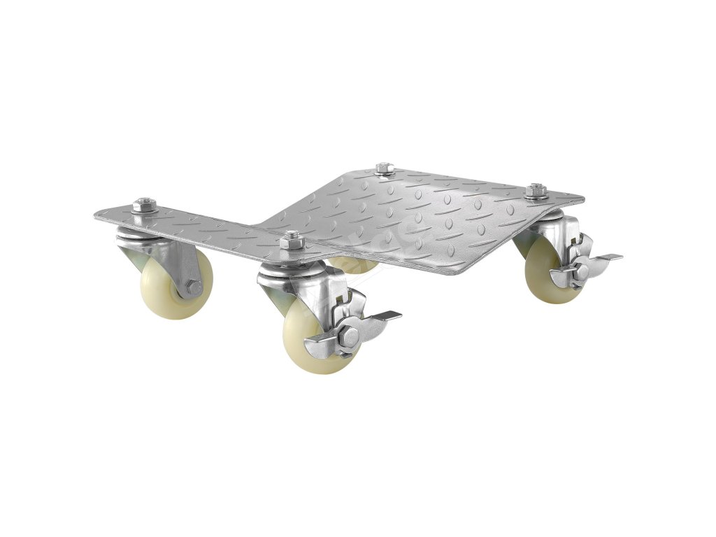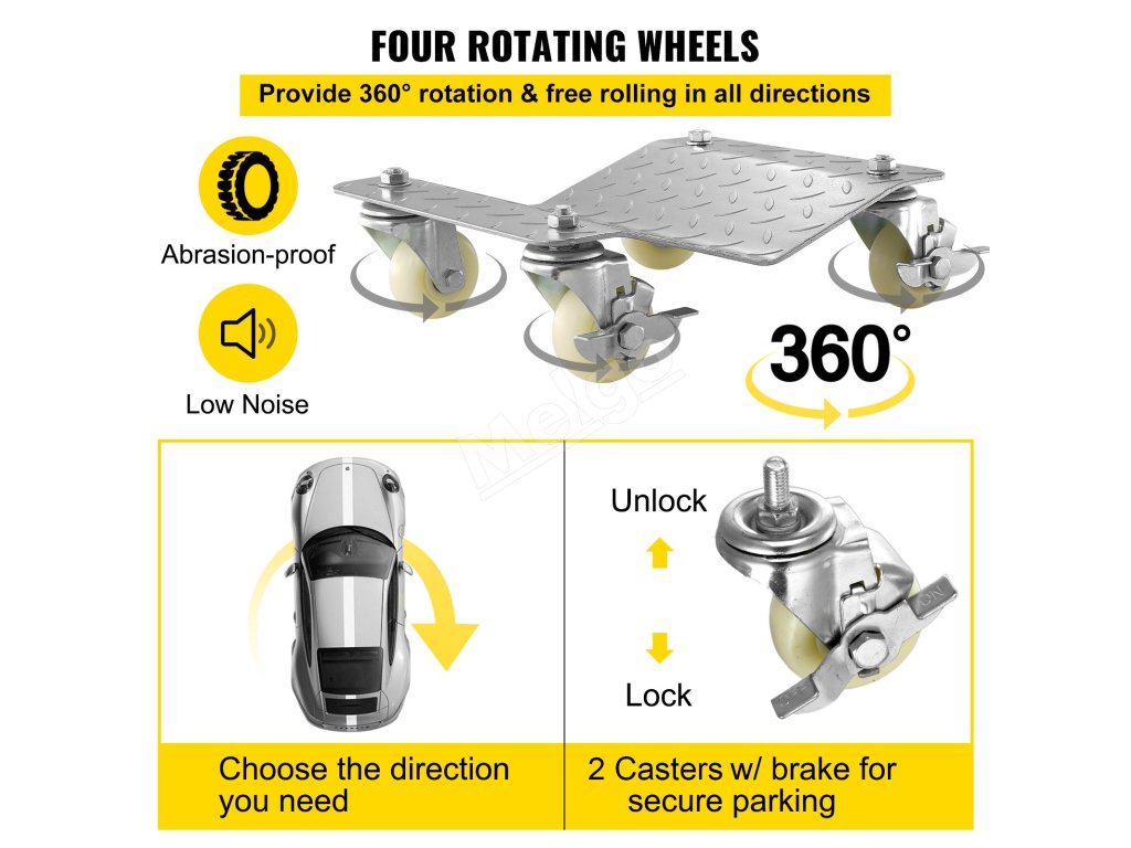 Na každej plošine na prepravu koliesok sú 4 flexibilné kolieska. 4 kolieska sa môžu plynule otáčať o 360 stupňov a dve z nich majú brzdy. Výsledkom je, že pneumatikou s kolesami auta môžete rýchlo pohybovať všetkými smermi a po dosiahnutí cieľa ju udržať zablokovanú.