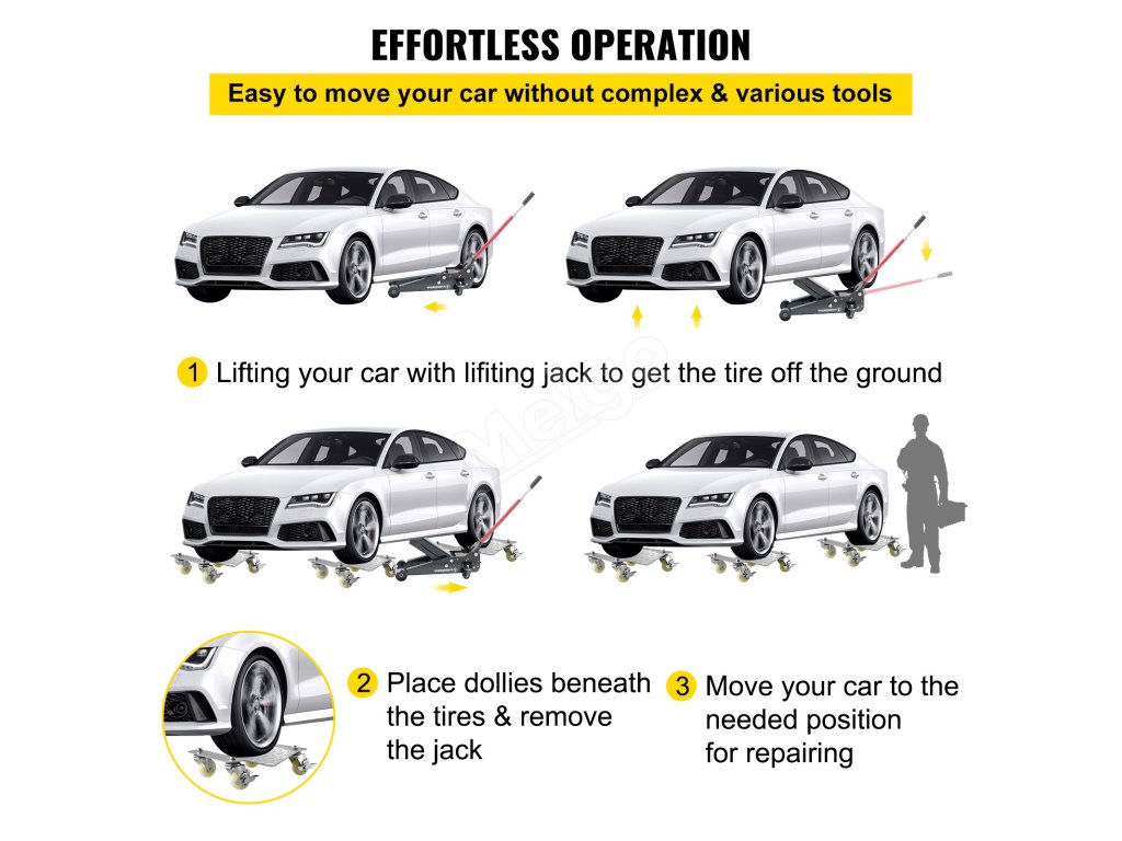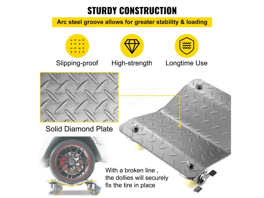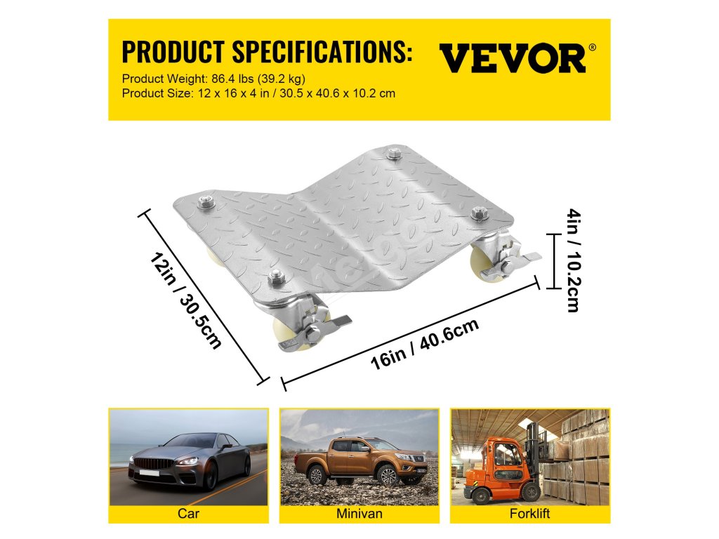 Každý vozík na korčule do auta unesie až 1100 lbs, celkovo 2200 lbs, a tento výrobok možno použiť na väčšinu automobilov na trhu. Preto dokáže rýchlo premiestniť vozidlo s najmasívnejšou hmotnosťou.