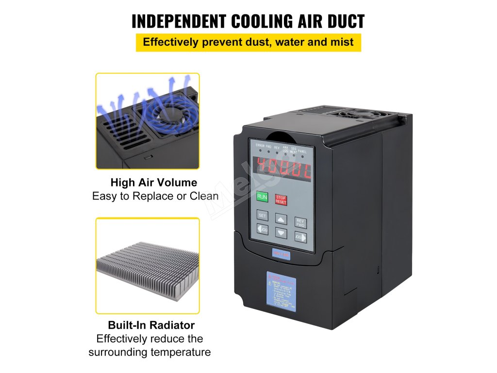 Vreteno VFD je vybavené chladením ventilátorom a zabudovaným chladičom. Má účinnú schopnosť odvádzať teplo, čím zabezpečuje vhodnú teplotu vo vnútri VFD. Okrem toho je nezávislý vzduchový kanál navrhnutý na elektrickú izoláciu a izoláciu od nečistôt, čo umožňuje používanie výrobku v náročných podmienkach.
