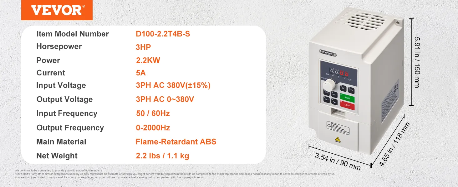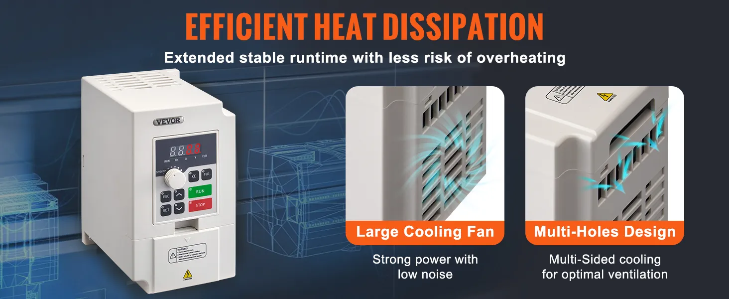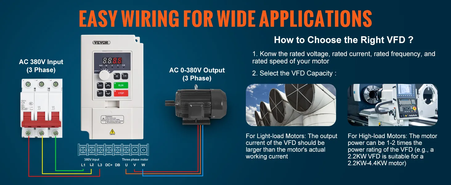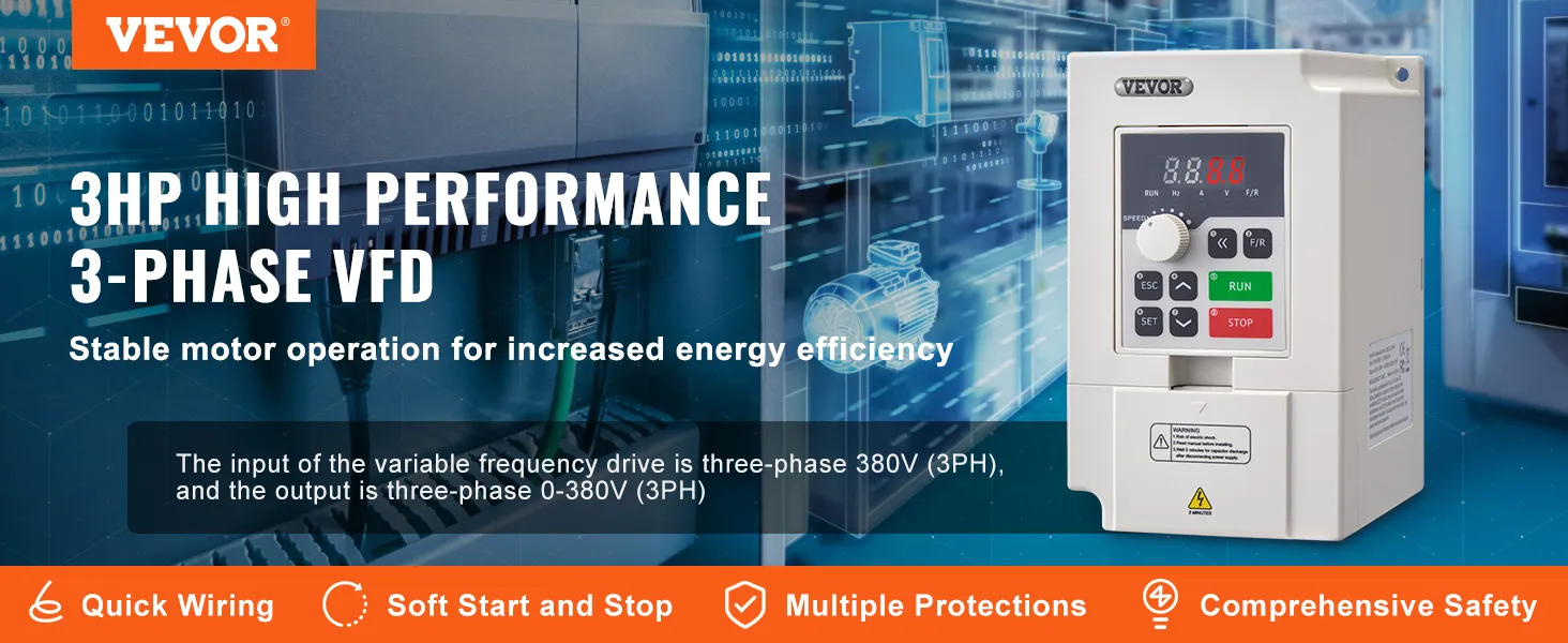 Vstupom VFD je trojfázový striedavý prúd 380 V a výstupom je trojfázový striedavý prúd 0 ~ 380 V, vstupná frekvencia je 50/60 Hz a výstupná frekvencia je 0 - 2 000 Hz. Vďaka jednoduchému zapojeniu, intuitívnemu displeju a komplexným ochranám zjednodušuje prevádzku a zvyšuje energetickú účinnosť.