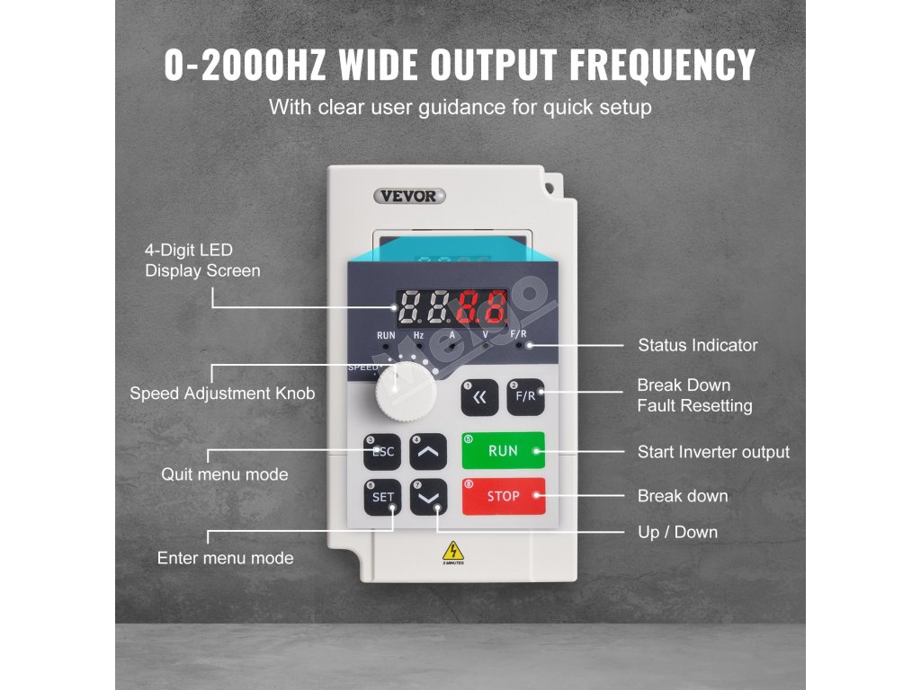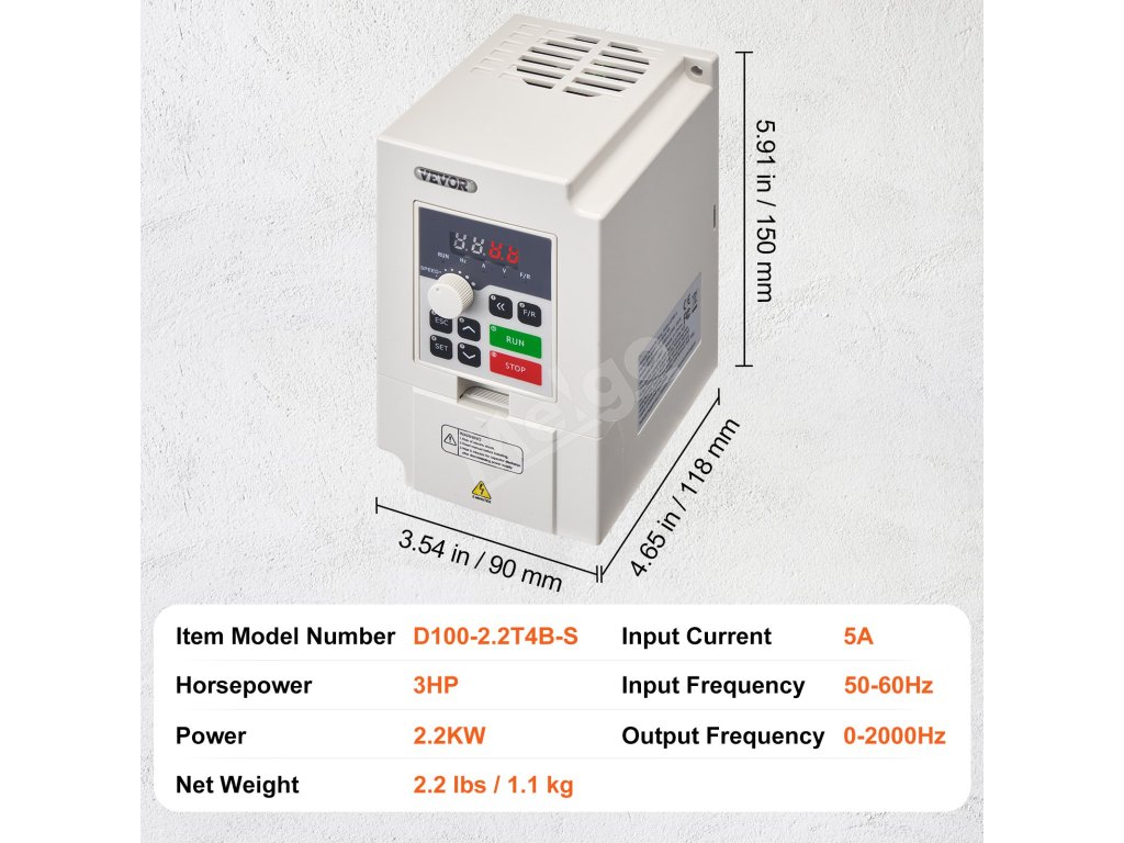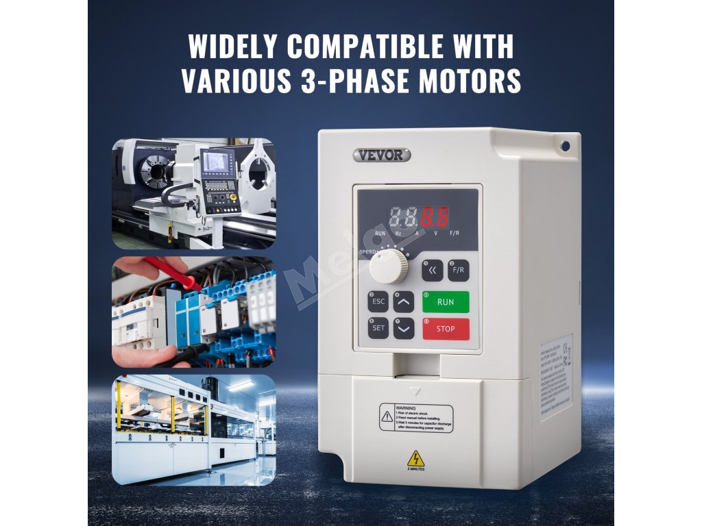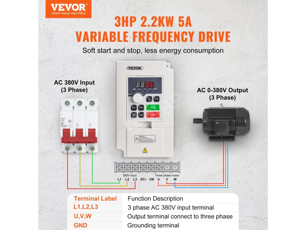 Vstupom VFD je trojfázový striedavý prúd 380 V a výstupom je trojfázový striedavý prúd 0 ~ 380 V, vstupná frekvencia je 50/60 Hz a výstupná frekvencia je 0 - 2 000 Hz. Vďaka jednoduchému zapojeniu, intuitívnemu displeju a komplexným ochranám zjednodušuje prevádzku a zvyšuje energetickú účinnosť.