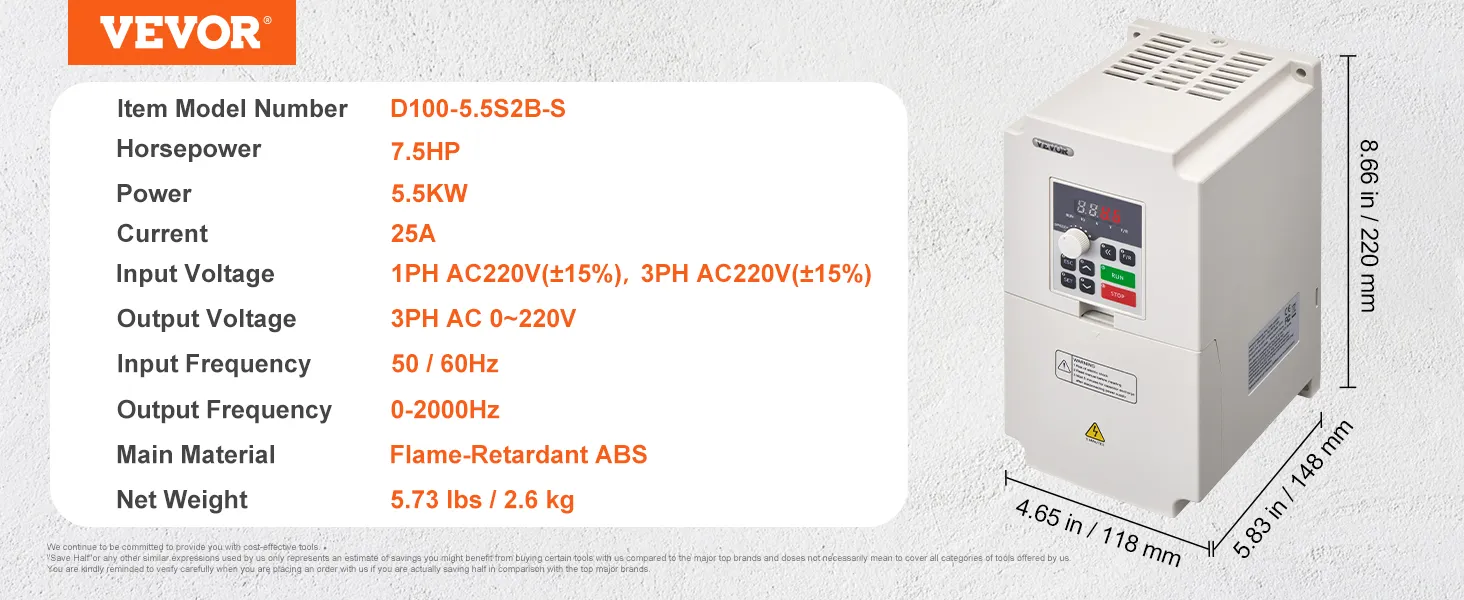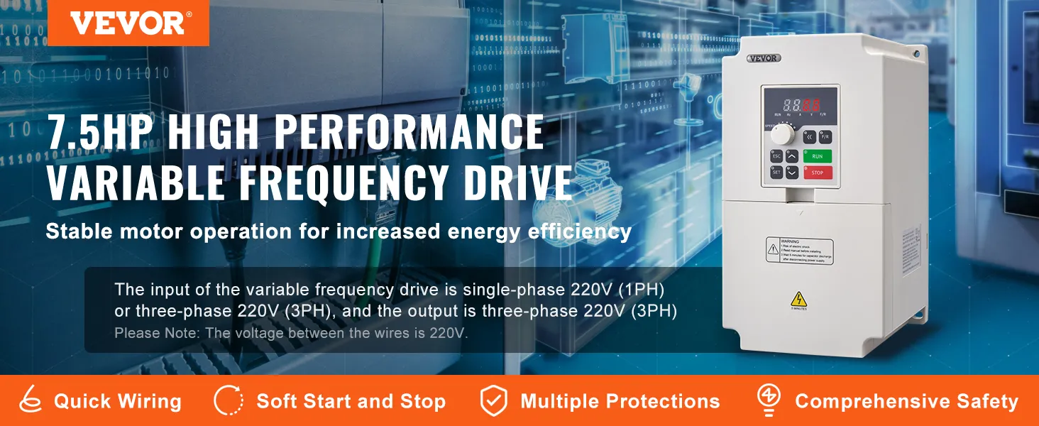 Vstupom VFD je jednofázové striedavé napätie 220 V (1PH) alebo trojfázové striedavé napätie 220 V (3PH) a výstupom je trojfázové striedavé napätie 0 ~ 220 V (3PH). Vďaka jednoduchému zapojeniu, intuitívnemu displeju a komplexným ochranám zjednodušuje prevádzku, zvyšuje energetickú účinnosť a minimalizuje poruchy strojov.