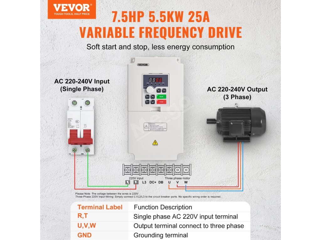 Vstupom VFD je jednofázové striedavé napätie 220 V (1PH) alebo trojfázové striedavé napätie 220 V (3PH) a výstupom je trojfázové striedavé napätie 0 ~ 220 V (3PH). Vďaka jednoduchému zapojeniu, intuitívnemu displeju a komplexným ochranám zjednodušuje prevádzku, zvyšuje energetickú účinnosť a minimalizuje poruchy strojov.