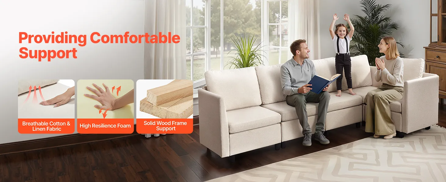 Táto modulárna pohovka obohatí vašu obývačkovú súpravu o vysokoodolnú penu a priedušnú bavlnenú látku pre dlhodobé pohodlie. Zabudovaný úložný priestor na sedenie šetrí miesto a zároveň dodáva vášmu domovu praktický štýl.