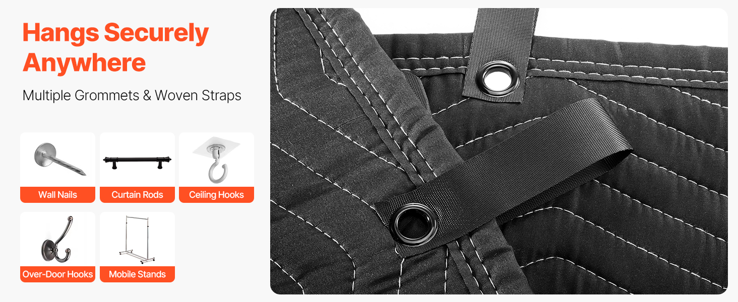 Prikrývka je vybavená tkanými popruhmi a priechodkami, vďaka čomu sa ľahko pripevní na záclonové tyče na inštaláciu bez použitia náradia. Žiadne vŕtanie, žiadne poškodenie steny - rýchlo zablokujte hluk od susedov.