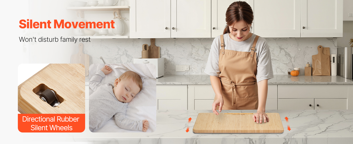Mäkké gumové kolieska posuvného podnosu chránia pracovné dosky, od mramoru po drevo. Presúvajte spotrebiče bezhlučne – bez rušenia členov rodiny, aby vaša kuchyňa zostala pokojná a tichá.