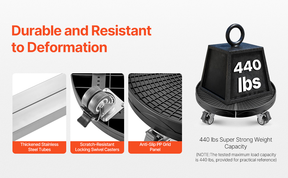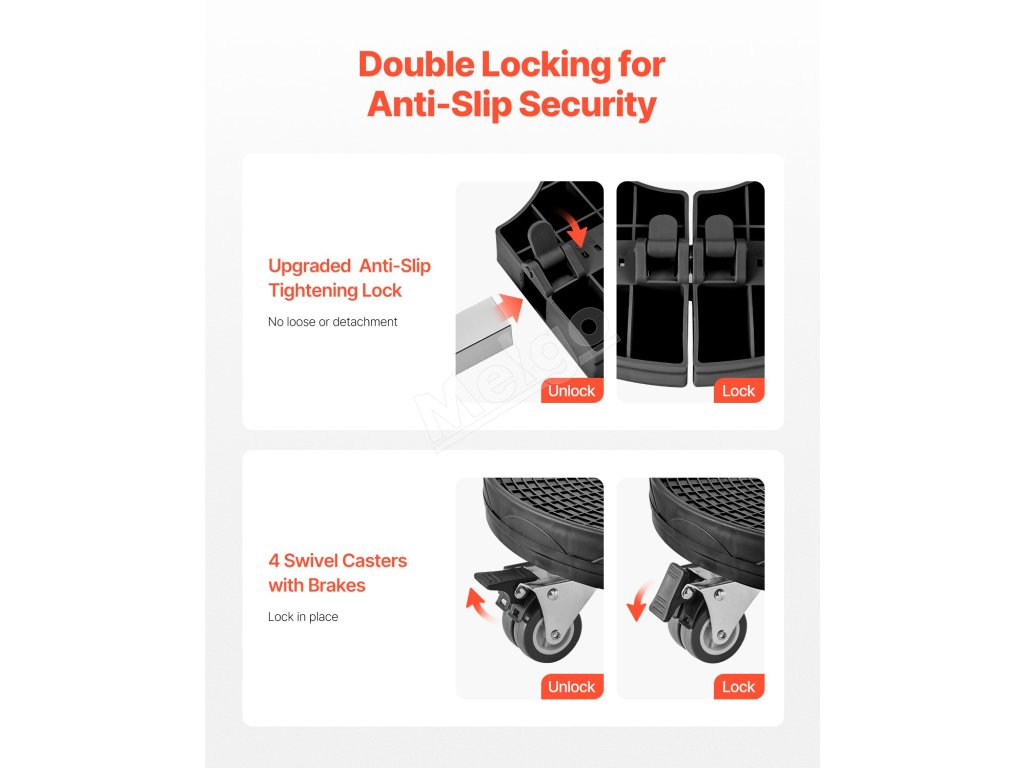 Zosilnený PP panel, rám z nehrdzavejúcej ocele a dvojradové uzamykateľné kolieska (nosnosť 400 libier) na jednoduchú prepravu. Protišmykový vzor mriežky zabezpečuje stabilitu počas prepravy.