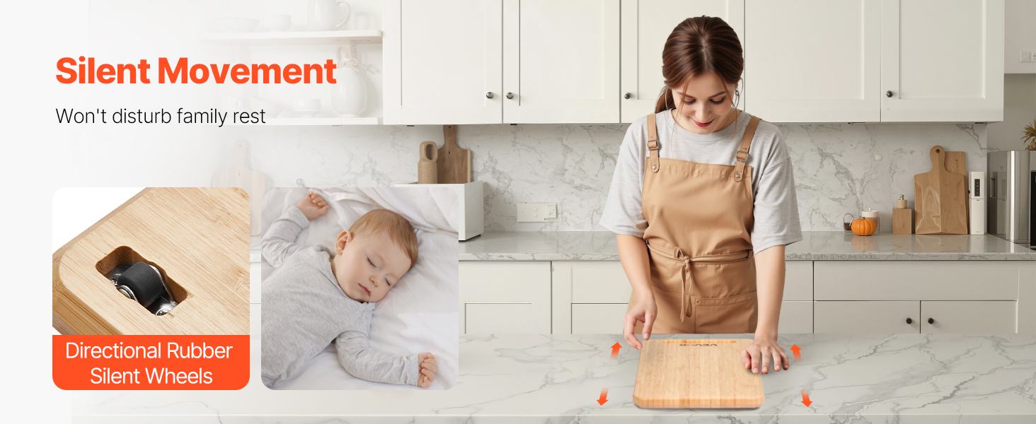 Mäkké gumové kolieska posuvného zásobníka zabezpečia pracovné dosky od mramorových až po drevené. Presúvajte spotrebiče potichu - žiadny hluk neruší členov rodiny, vďaka čomu zostane vo vašej kuchyni pokoj a ticho.
