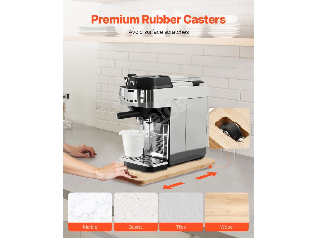 Mäkké gumové kolieska posuvného zásobníka zabezpečia pracovné dosky od mramorových až po drevené. Presúvajte spotrebiče potichu - žiadny hluk neruší členov rodiny, vďaka čomu zostane vo vašej kuchyni pokoj a ticho.