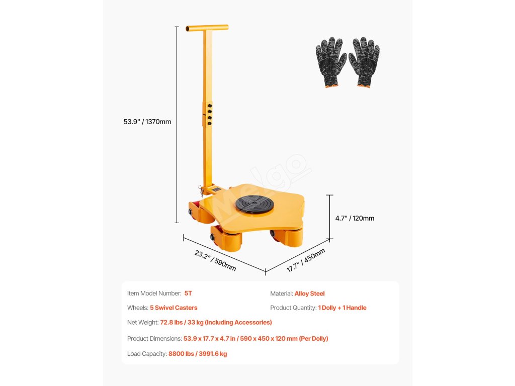 Presúvač strojov 8800 lbs, 360° otočný čap, pu otočné kolieska