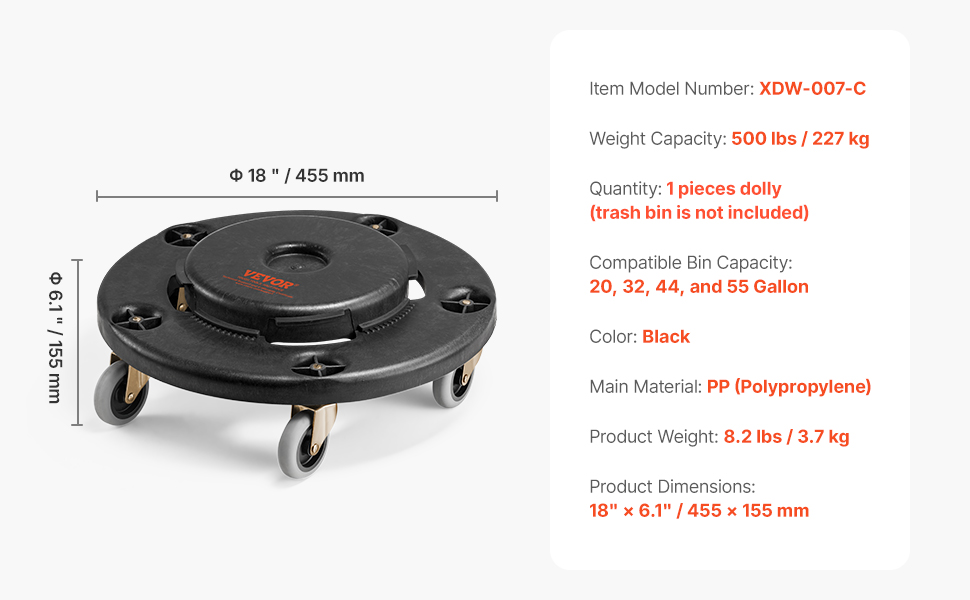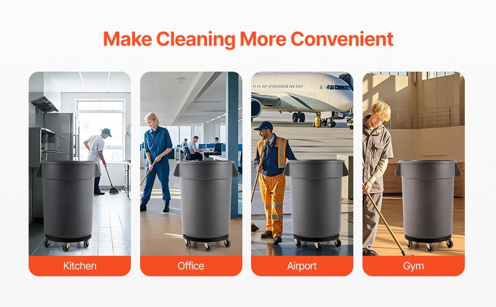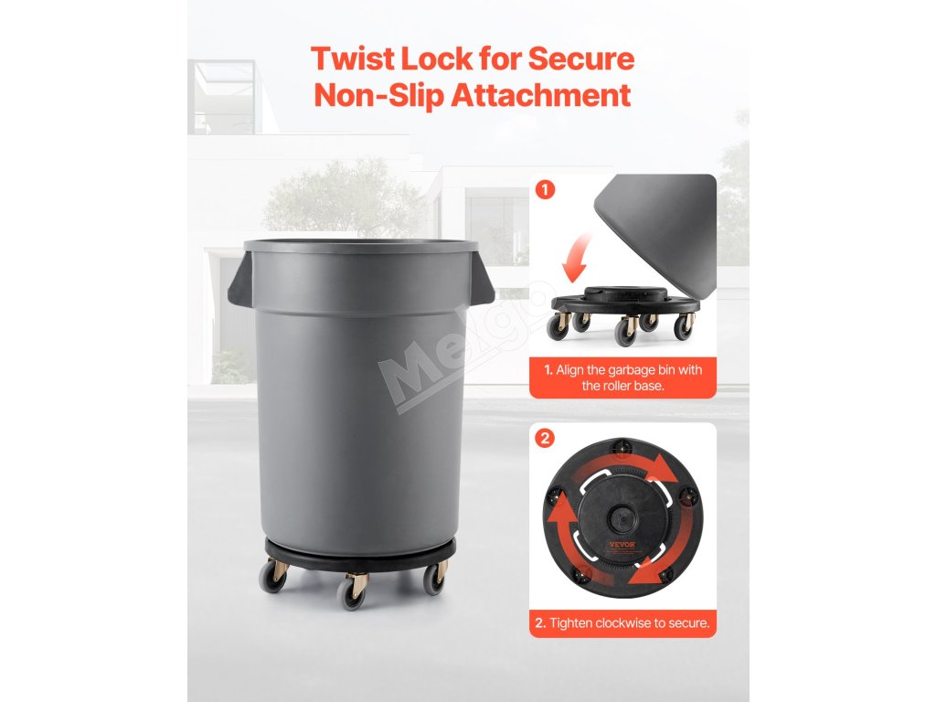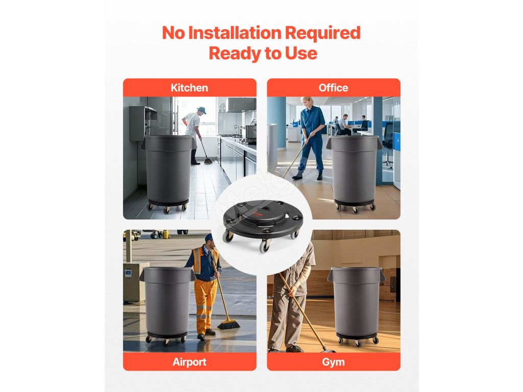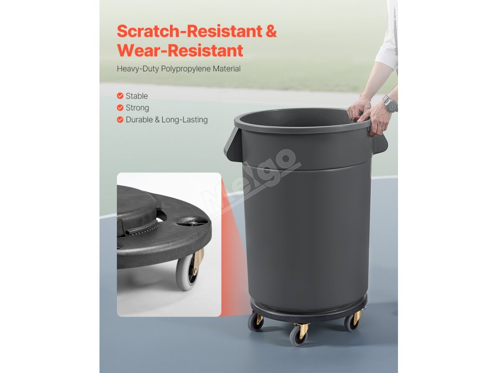 Tento vozík na odpadky, ktorý je kompatibilný s 20/32/44/55-galónovými kontajnermi, zjednodušuje prepravu odpadu a zároveň znižuje fyzickú záťaž. Jeho systém otočného zámku bezpečne upevňuje koše otáčaním v smere hodinových ručičiek, čím zabezpečuje stabilitu. Päť 3" otočných koliesok umožňuje tiché manévrovanie po podlahe bez poškriabania.
