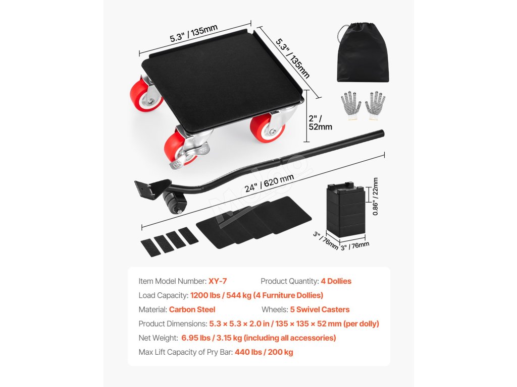 Vozík na nábytok, nosnosť 1200 lbs, 5×360° kolies, oceľová doska