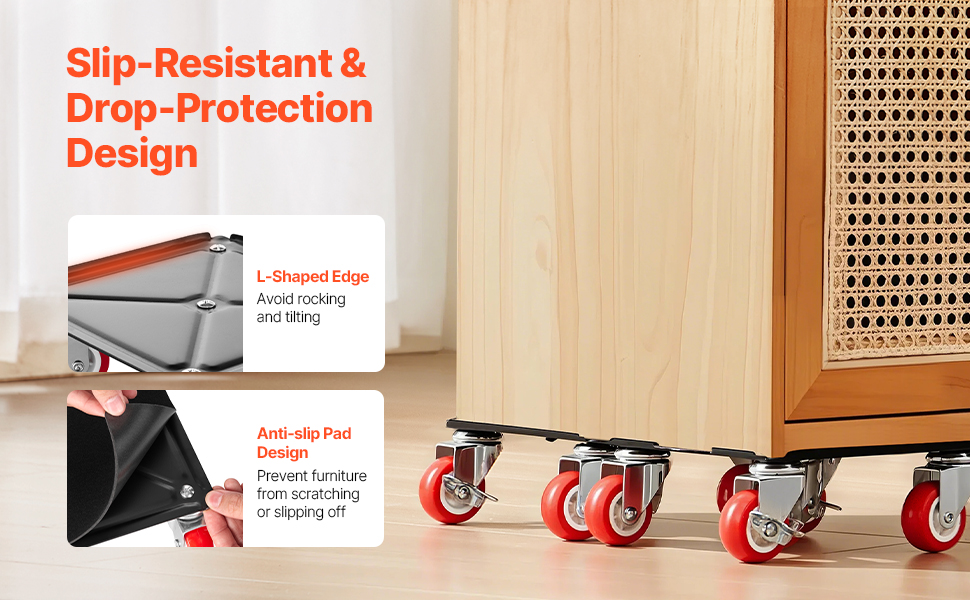 Vysokokvalitné protišmykové materiály v kombinácii s premyslenou konštrukciou nášho vozíka na nábytok poskytujú bezpečný zážitok z presunu a minimalizujú riziko nehôd.