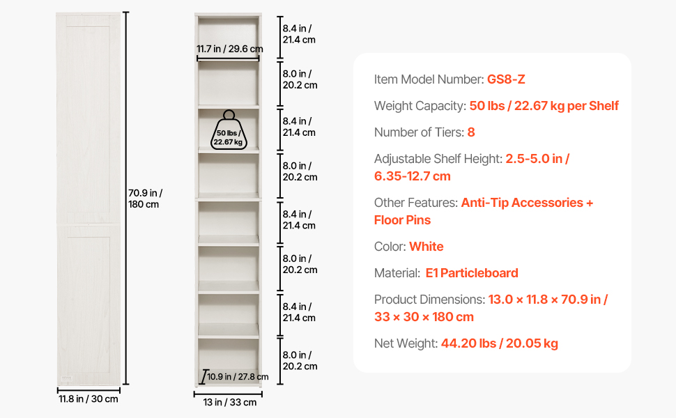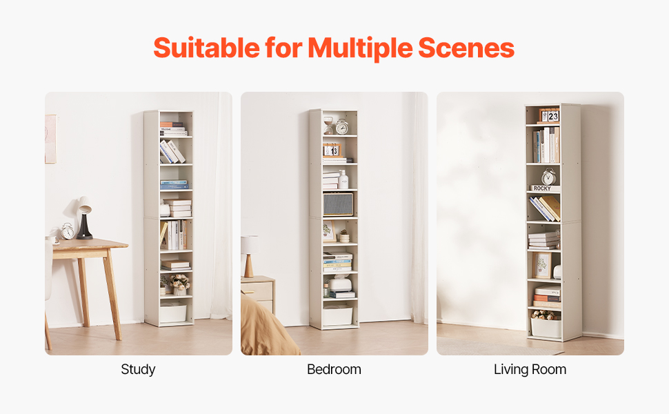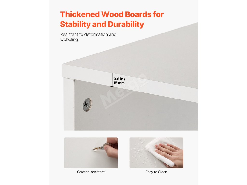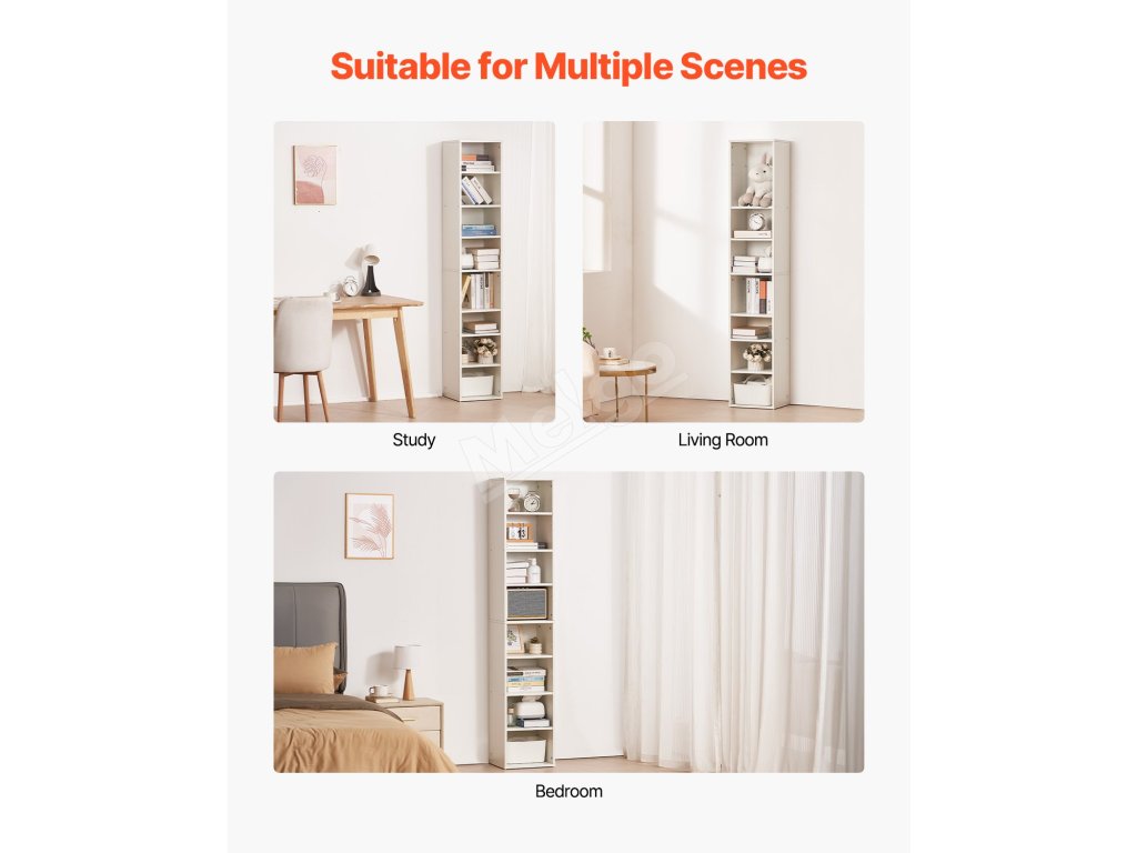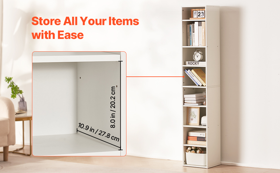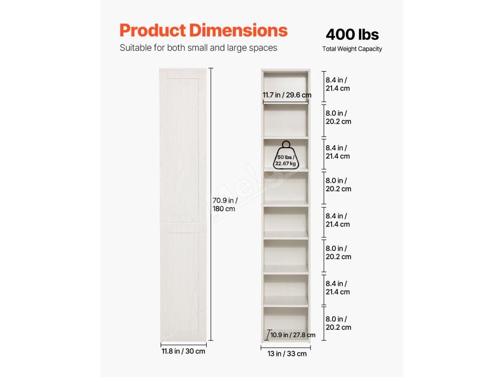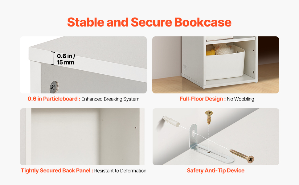 Je vyrobená z 0,6 palca hrubej drevotrieskovej dosky a každá polica unesie až 50 libier / 22,67 kg. Tesne priliehajúci zadný panel a celoplošná základná konštrukcia dodávajú dodatočnú oporu, vďaka čomu sa vysoká policová knižnica nedeformuje ani nezlomí, ani keď je plne naložená knihami.