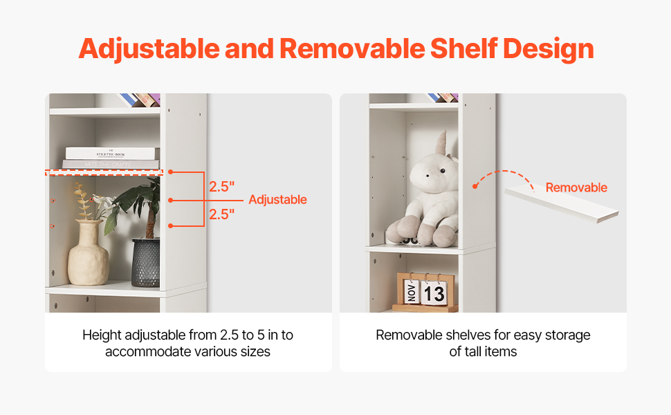 Prvá, tretia a štvrtá polica sú nastaviteľné a pohybujú sa nahor alebo nadol o 2,5 palca / 6,35 cm. To vám umožní ľahko umiestniť vyššie knihy, vázy alebo umelecké diela.