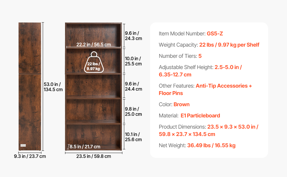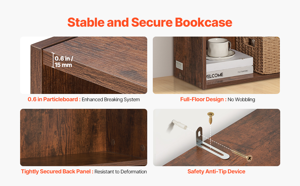 Je vyrobená z 0,6 palca hrubej drevotrieskovej dosky a každá polica unesie až 22 libier / 9,97 kg. Tesne priliehajúci zadný panel a celoplošná základná konštrukcia dodávajú dodatočnú oporu, vďaka čomu sa vysoká policová knižnica nedeformuje ani nezlomí, ani keď je plne naložená knihami.