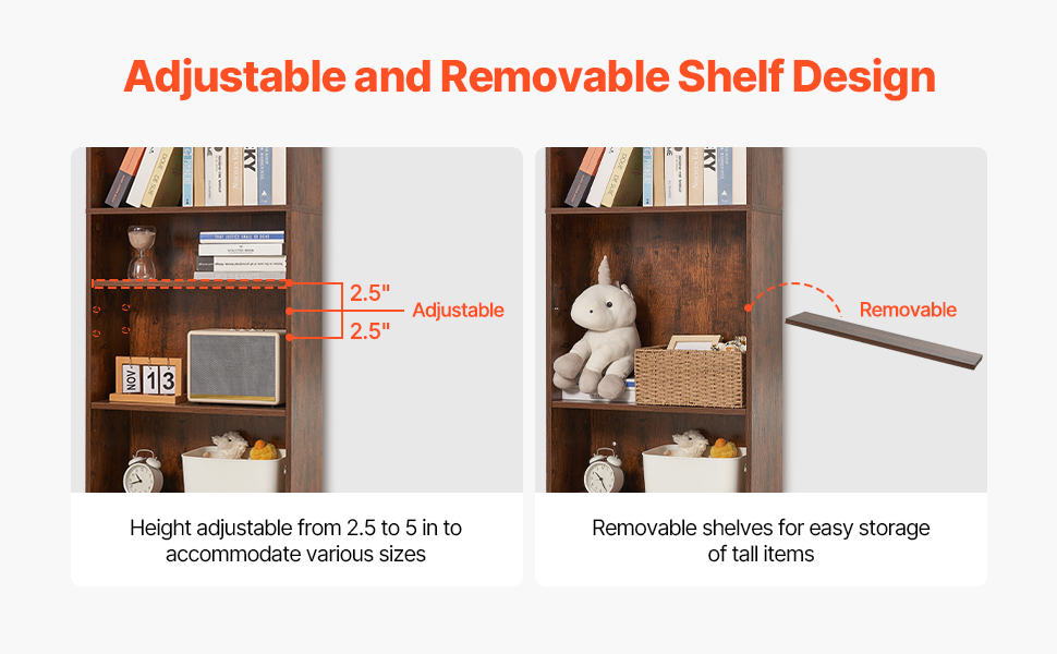 Prvá, tretia a štvrtá polica sú nastaviteľné a pohybujú sa nahor alebo nadol o 2,5 palca / 6,35 cm. To vám umožní ľahko umiestniť vyššie knihy, vázy alebo umelecké diela.