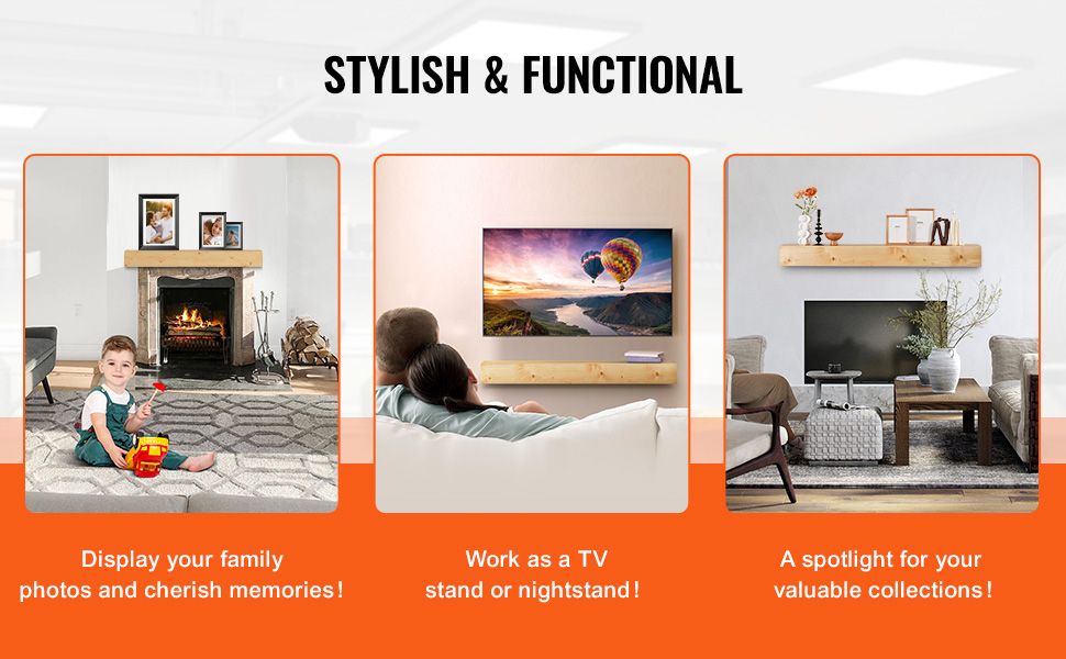 Drevená nástenná krbová rímsa 72"×8"×5", nosnosť 50 lbs, prírodná