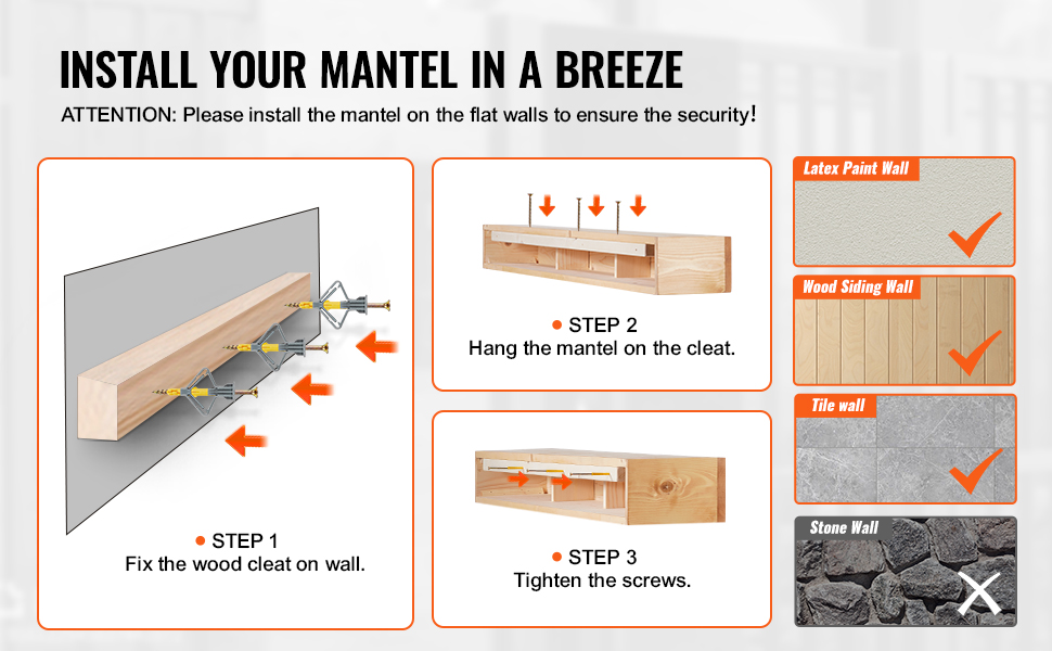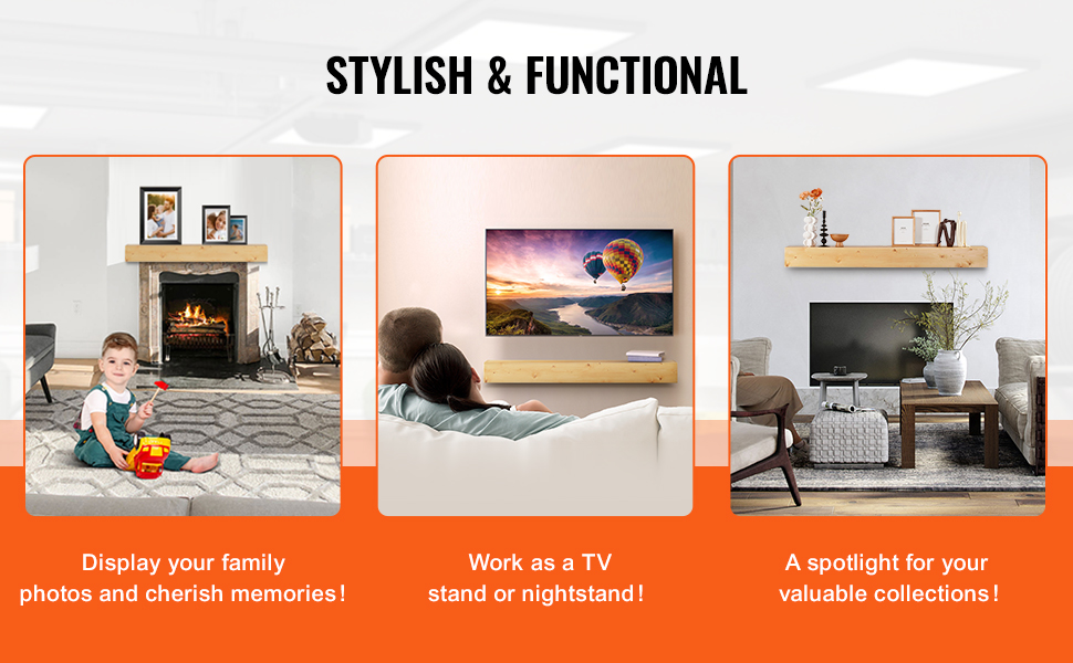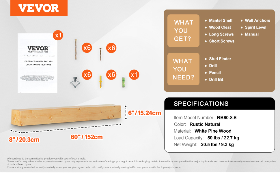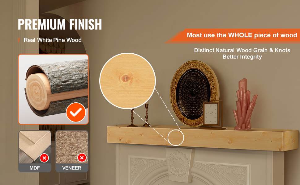Krbový mantel 60"×8"×6", drevo, nosnosť 50 lbs, nástenný plávajúci