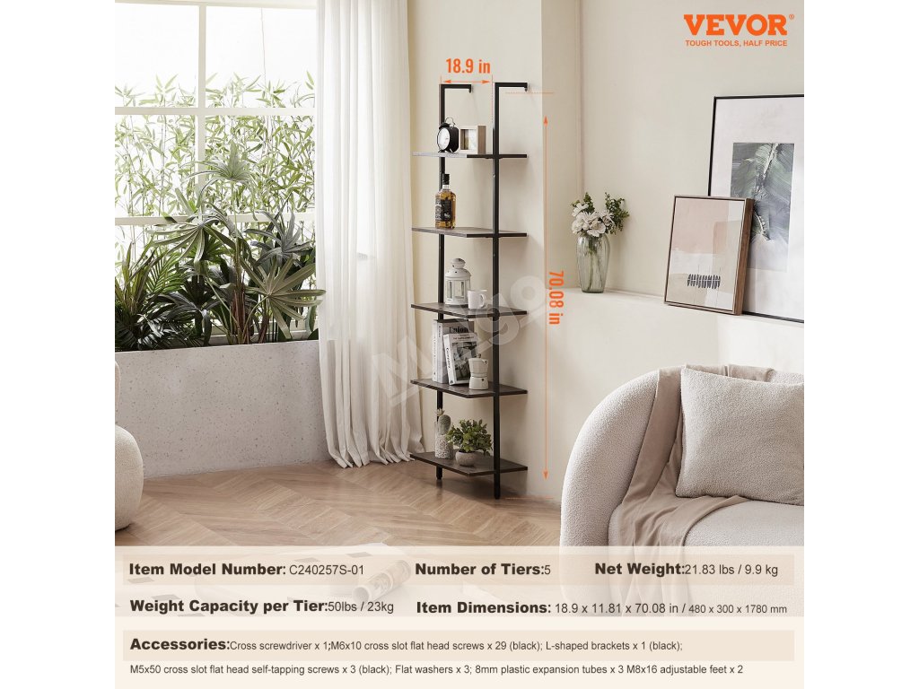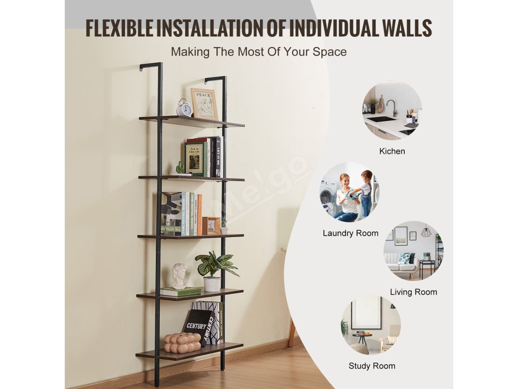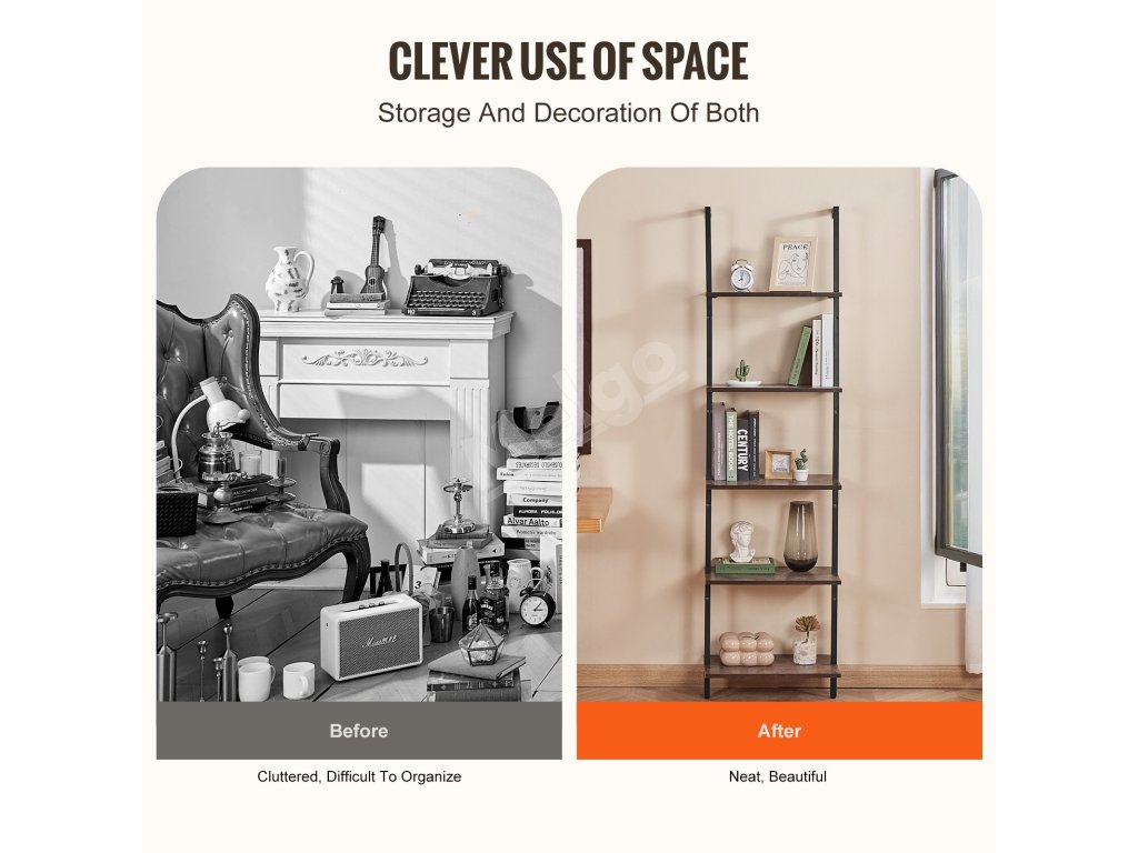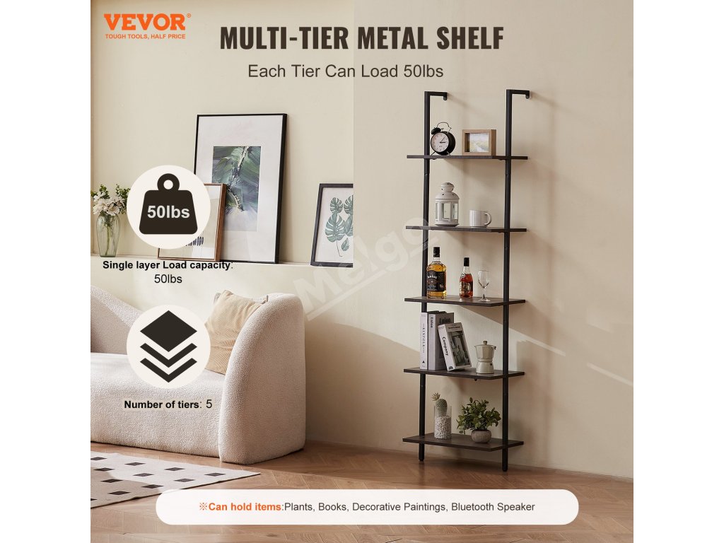 Nástenná rebríková polica 5 políc, 17.3×11.8in, s kovovým rámom