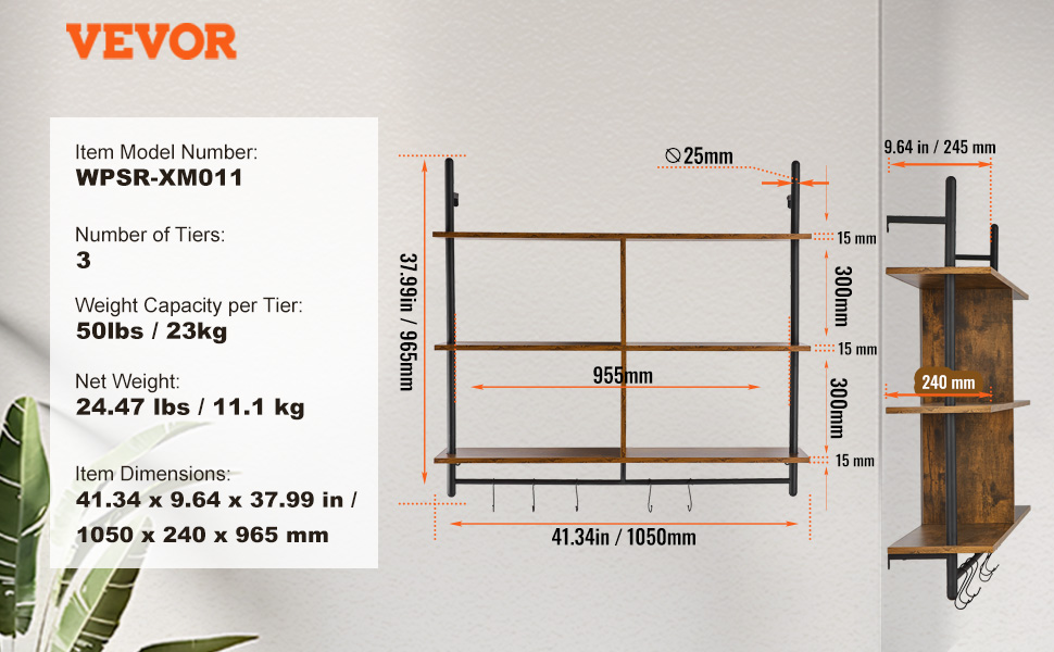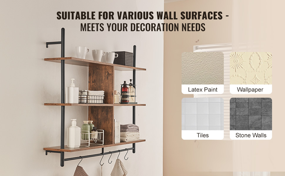 Nástenná rúrková polica 3-poschodová 41.5×9.84in drevené police čierna