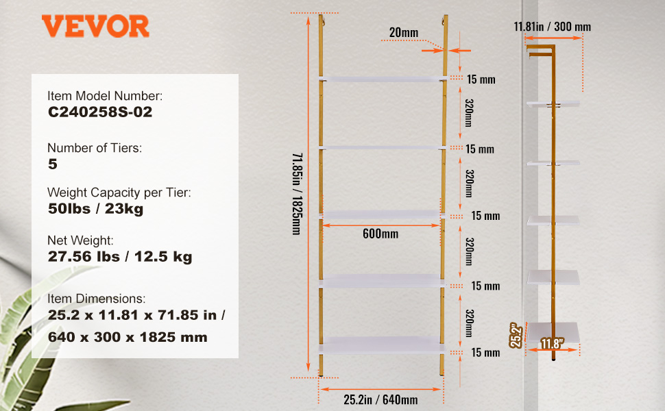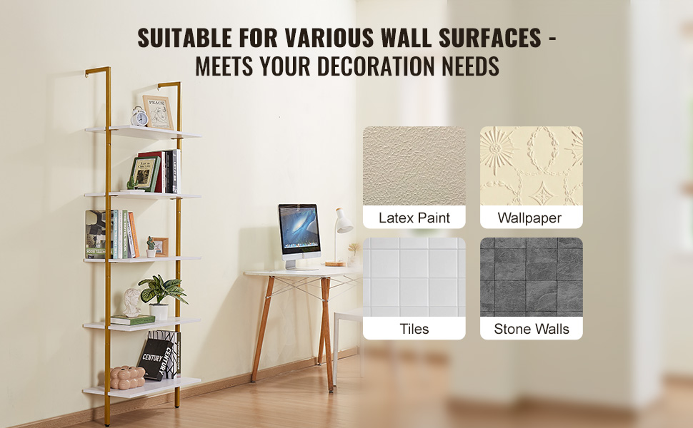Rebríková nástenná polica, 5 políc, 24×11.8in, kovový rám, otvorená