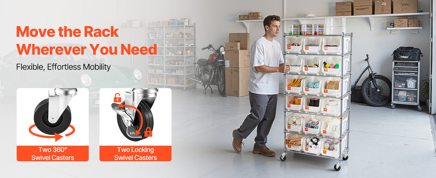 Tento regál na organizovanie zásobníkov na súčiastky sa pohybuje na dvoch otočných kolieskach a dvoch uzamykateľných otočných kolieskach na rýchle otočenie v stiesnených priestoroch. Brzdy sa zacvaknú a vaša zostava zostane na mieste, zatiaľ čo vy nakladáte, triedite a chytáte.