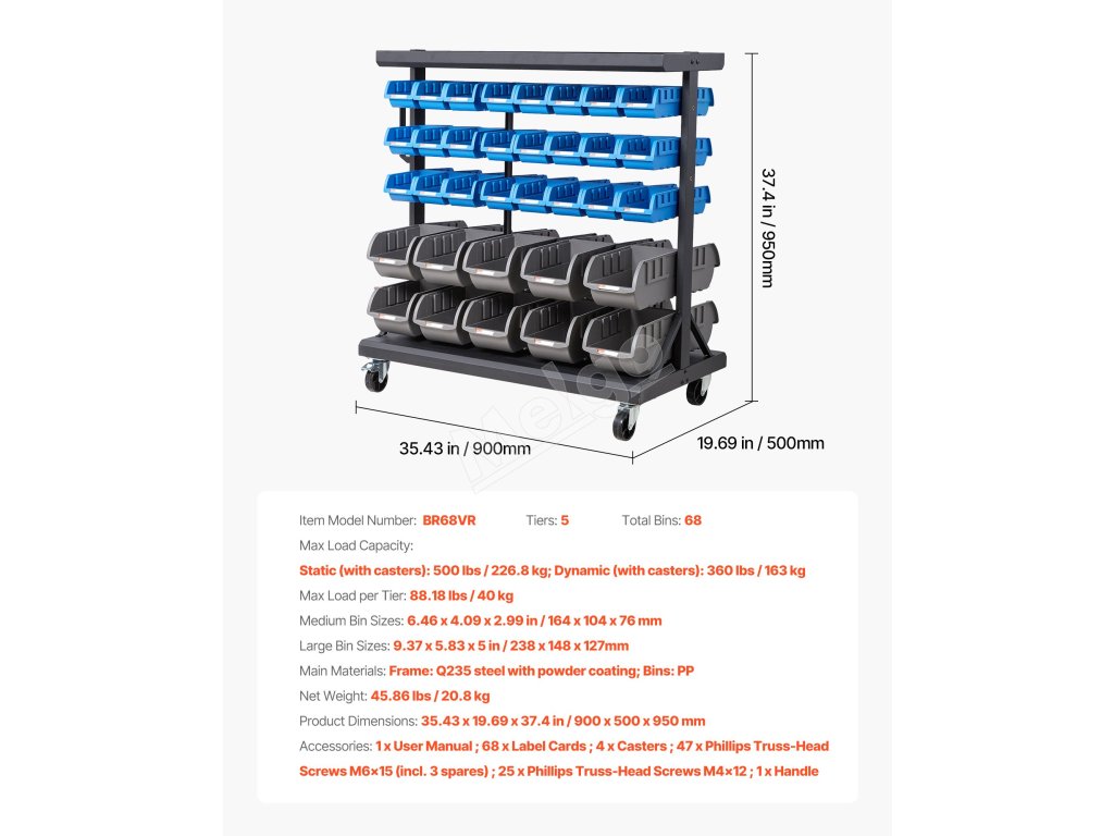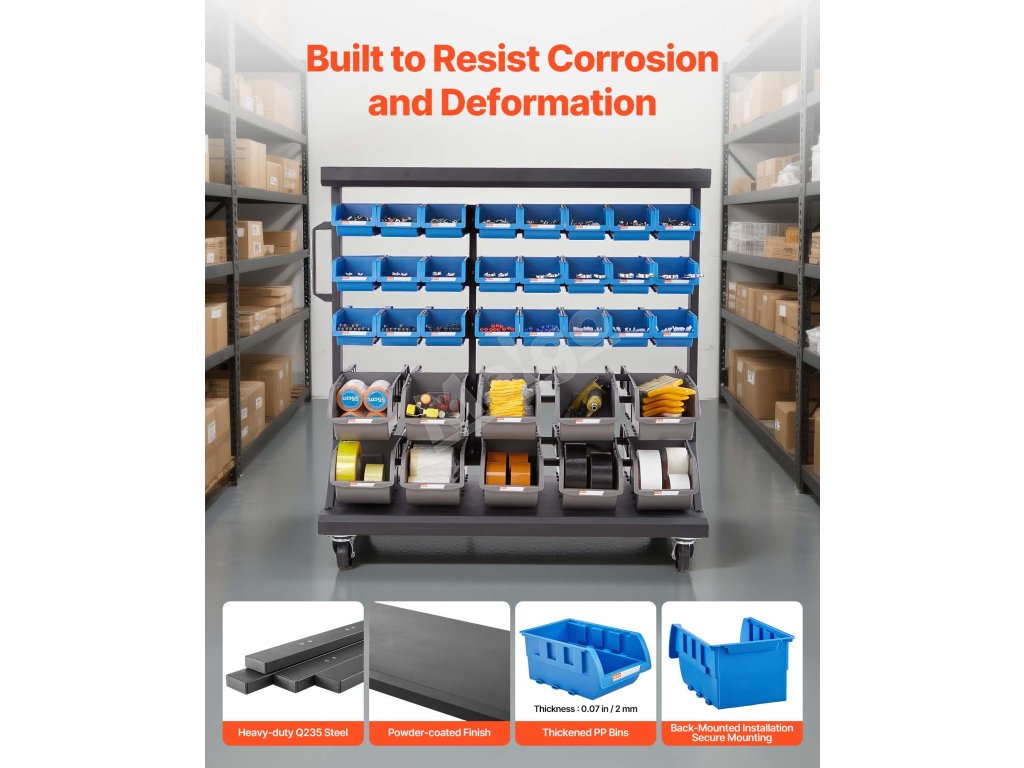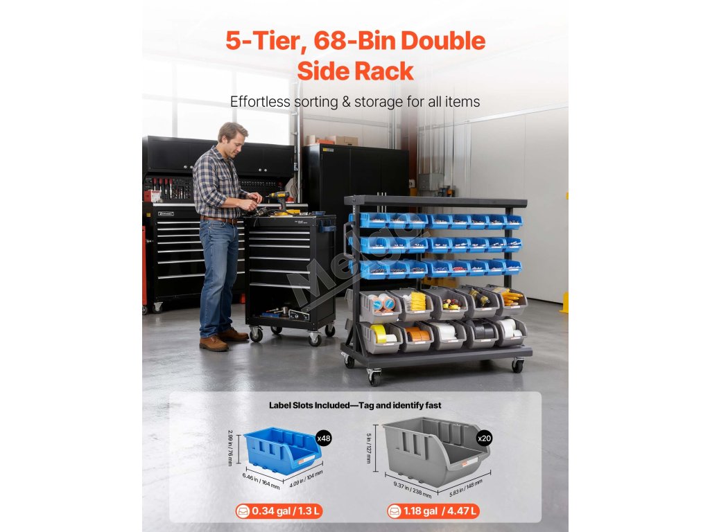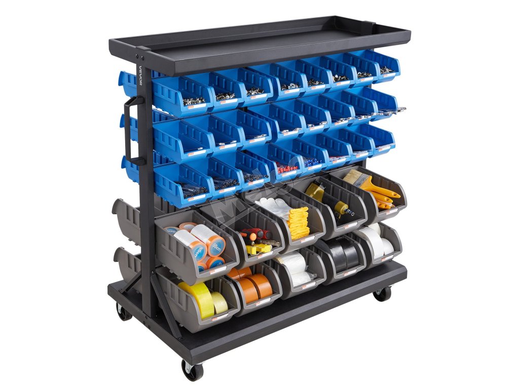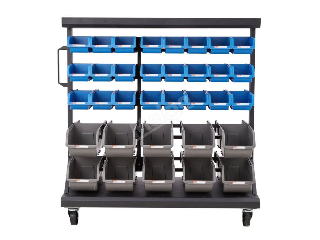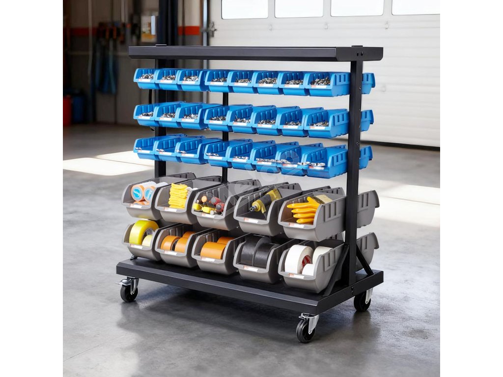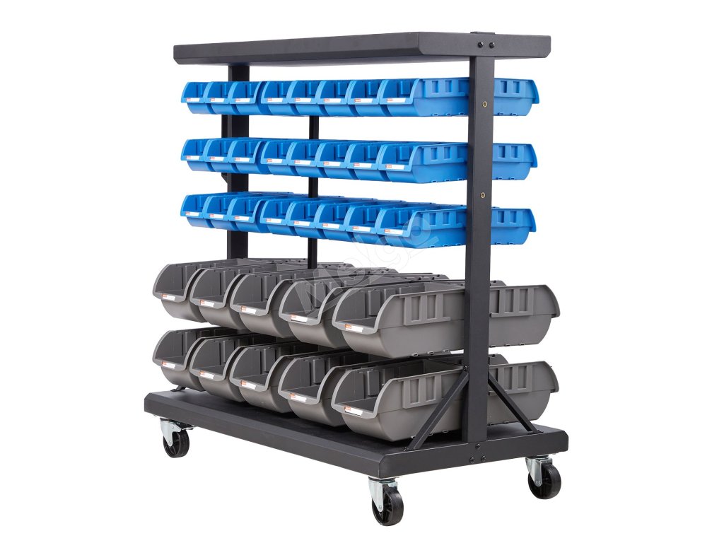 Pojazdný obojstranný regál s 68 plastovými boxmi, 5 políc s kolieskami