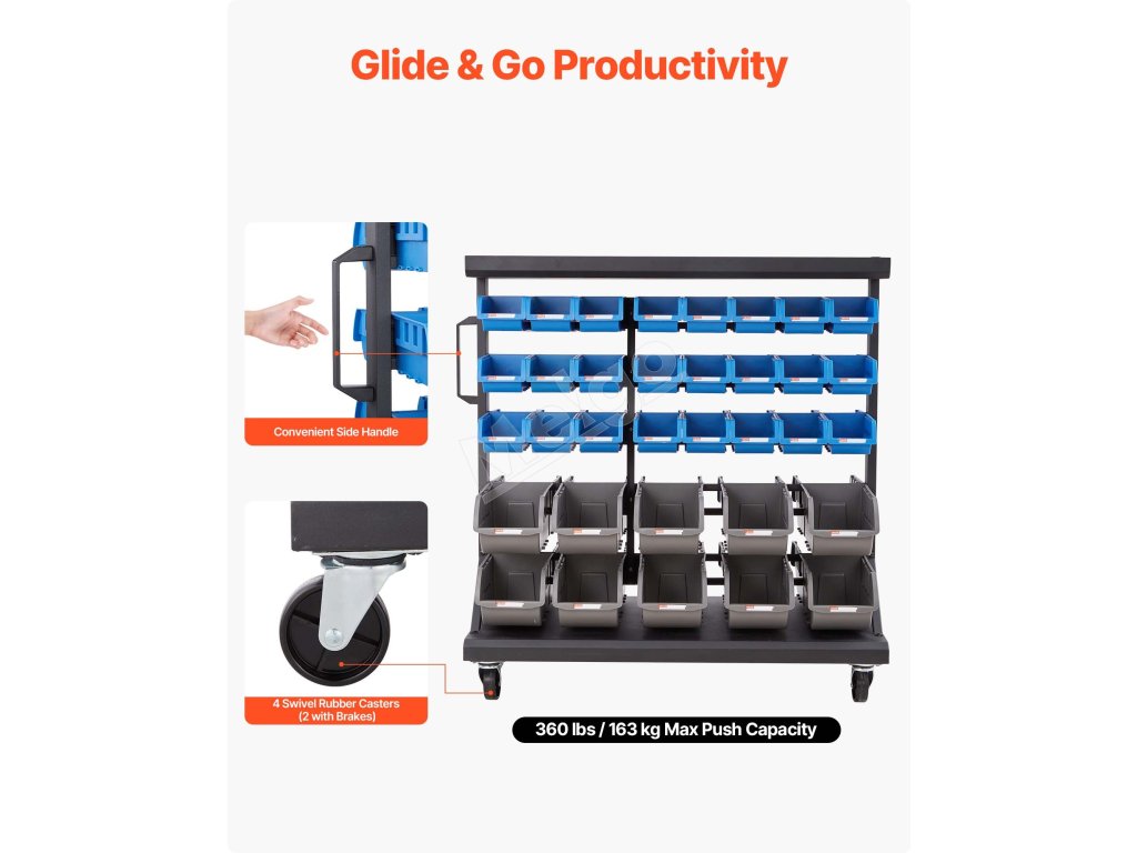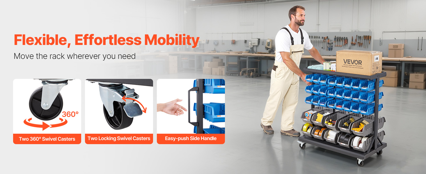 Tento regál na organizovanie zásobníkov na súčiastky sa otáča na štyroch 360° kolieskach a dve kolieska s aretáciou držia polohu pri parkovaní. Bočná rukoväť vám umožní plynulé ovládanie v úzkych uličkách a širokých priestoroch. Vďaka nastaveniu je premiestňovanie ľahké a jednoduché.