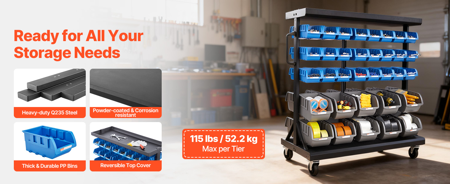 Každá polica organizéra na koše unesie až 88 lb (40 kg) na každodenné úlohy. Práškovo lakovaný rám Q235 je odolný voči opotrebovaniu. Hrubé zásobníky z PP vydržia časté používanie. Výklopné kryty vám pomôžu uložiť viac bez toho, aby ste si pridávali neporiadok.