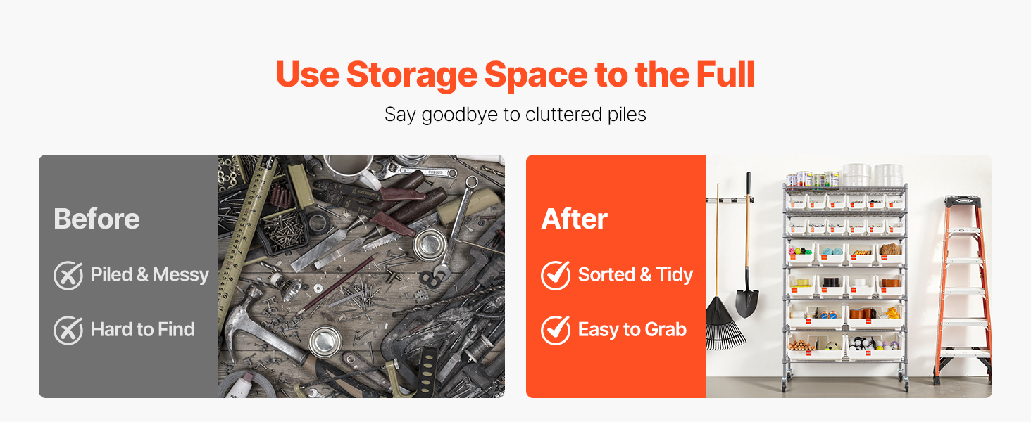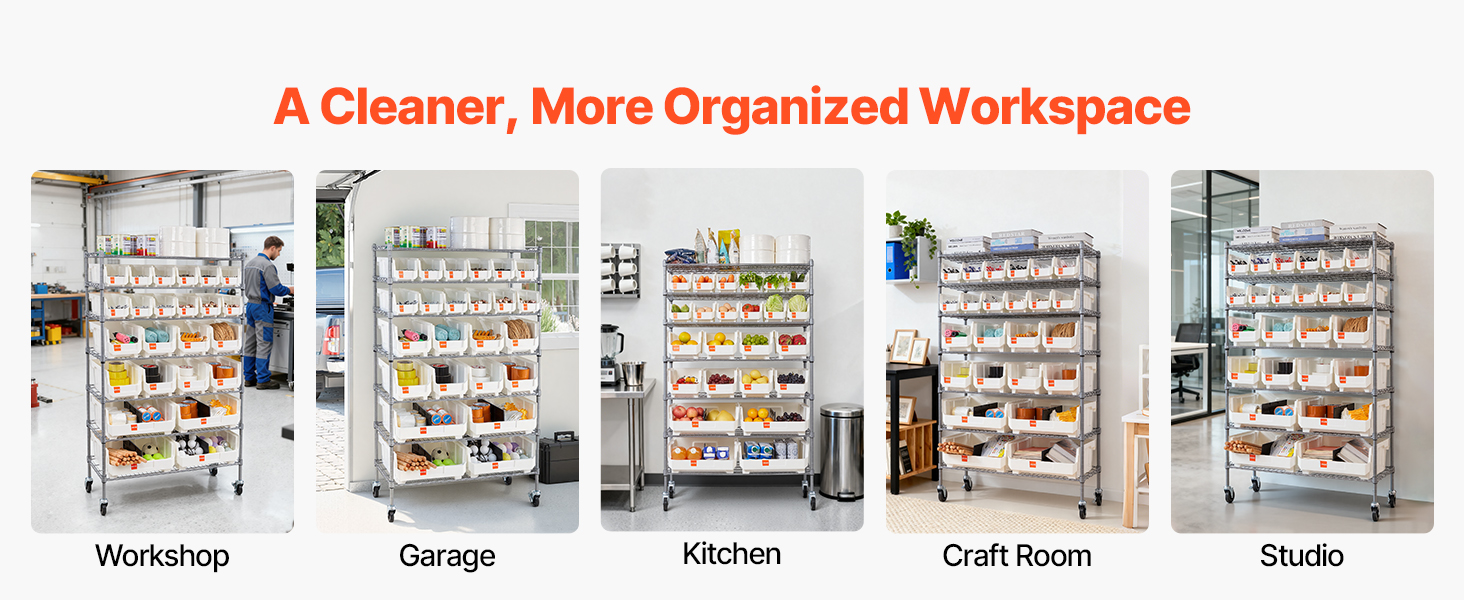 Tento regál na ukladanie košov spája vrstvené police s rôznymi košmi, aby sa rýchlo upokojil neporiadok. Vaše náradie, súčiastky a kancelárske kúsky nájdu svoj domov a váš pracovný proces dostane každý deň malý poriadok.
