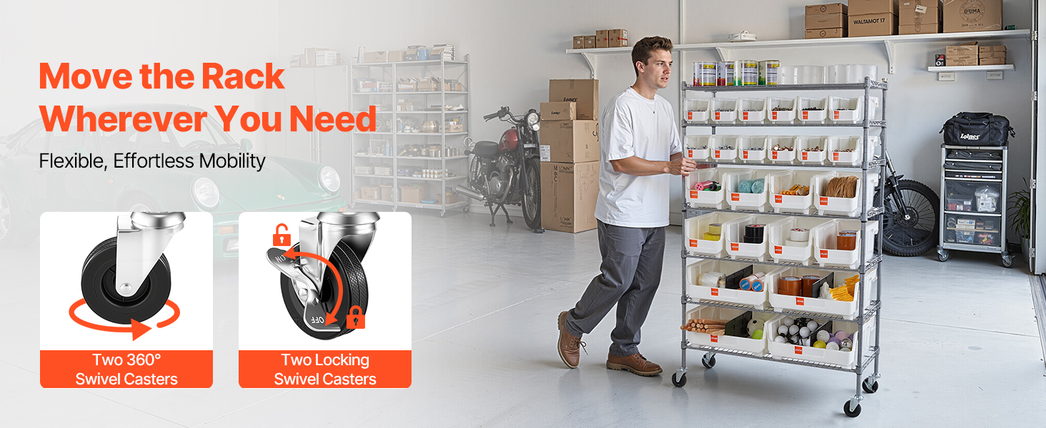 Tento regál na organizovanie zásobníkov na súčiastky sa pohybuje na dvoch otočných kolieskach a dvoch uzamykateľných otočných kolieskach na rýchle otočenie v stiesnených priestoroch. Brzdy sa zacvaknú a vaša zostava zostane na mieste, zatiaľ čo vy nakladáte, triedite a chytáte.