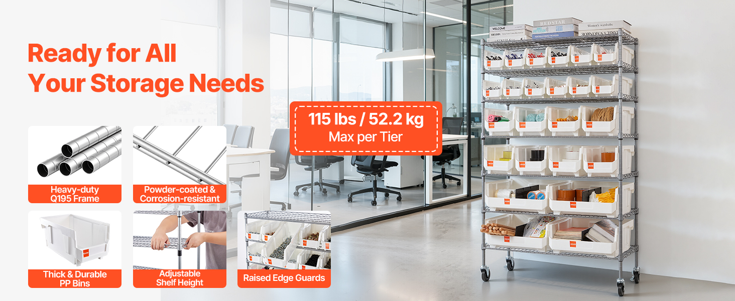 Každý regál na organizovanie zásobníkov unesie až 115 lb (52,2 kg) na isté každodenné používanie. Práškovo lakovaný rám Q195 odoláva opotrebovaniu, zatiaľ čo robustné koše z PP a vyvýšené koľajničky pomáhajú udržať predmety presne tam, kde ich chcete mať.