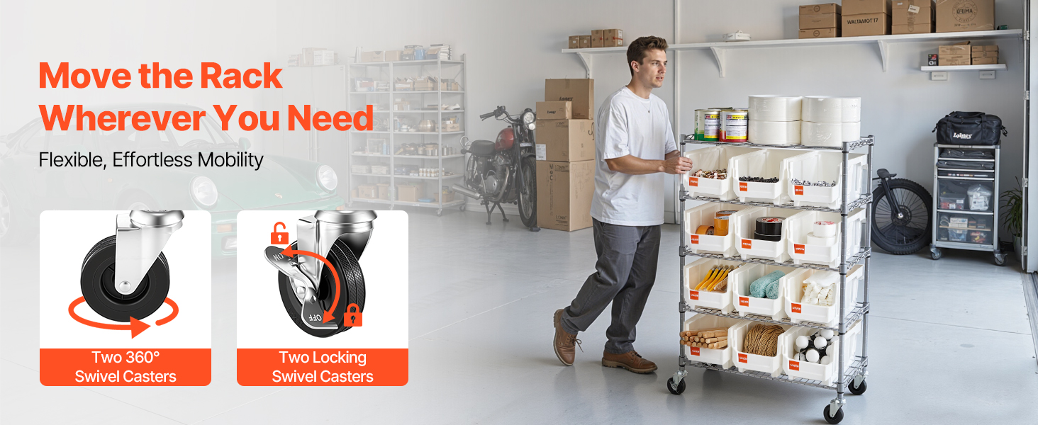 Tento regál na organizovanie zásobníkov na súčiastky sa pohybuje na dvoch otočných kolieskach a dvoch uzamykateľných otočných kolieskach na rýchle otočenie v stiesnených priestoroch. Brzdy sa zacvaknú a vaša zostava zostane na mieste, zatiaľ čo vy nakladáte, triedite a chytáte.
